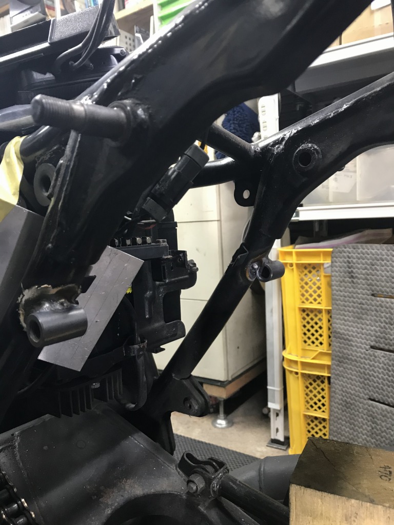 タンデムステップ用のボスを製作し、フレームに溶接します。お子さんが乗るので高い位置でもOKとのこと。
