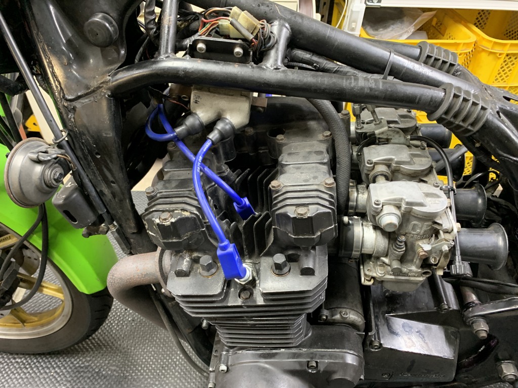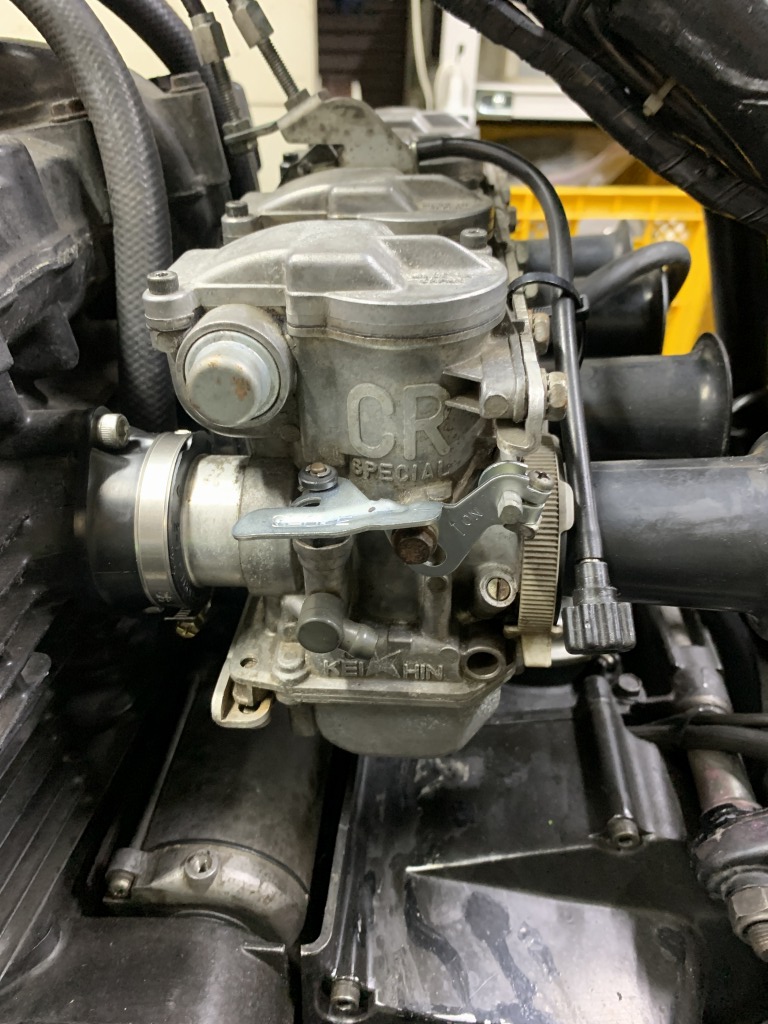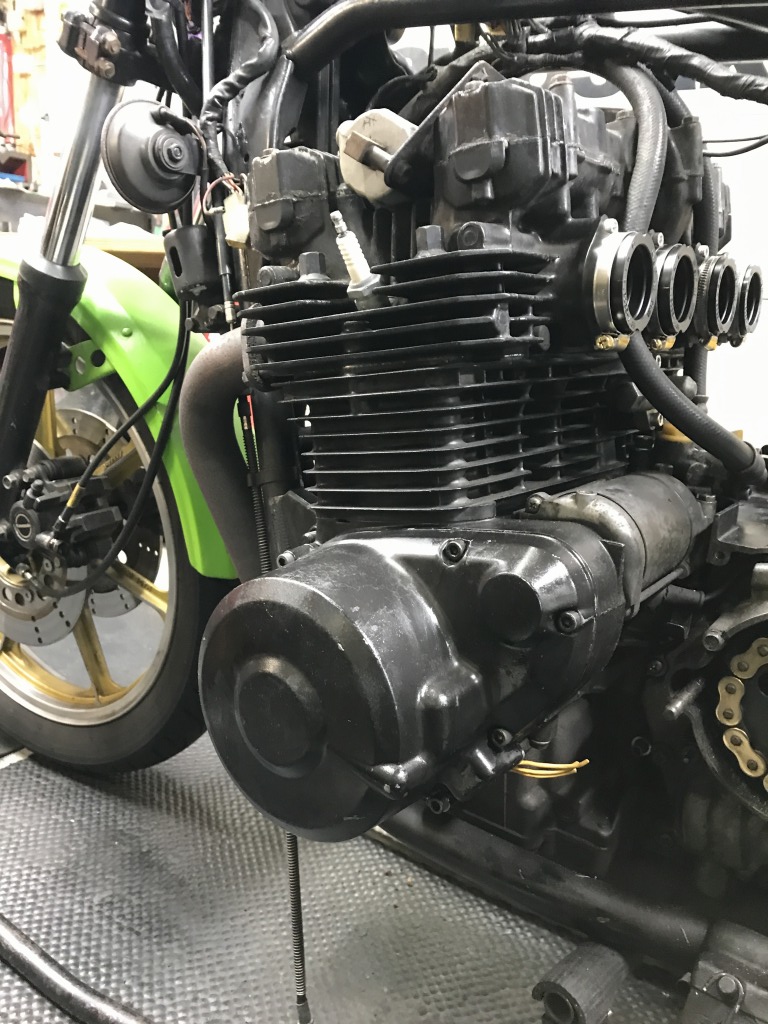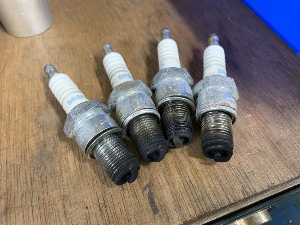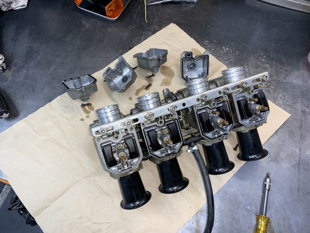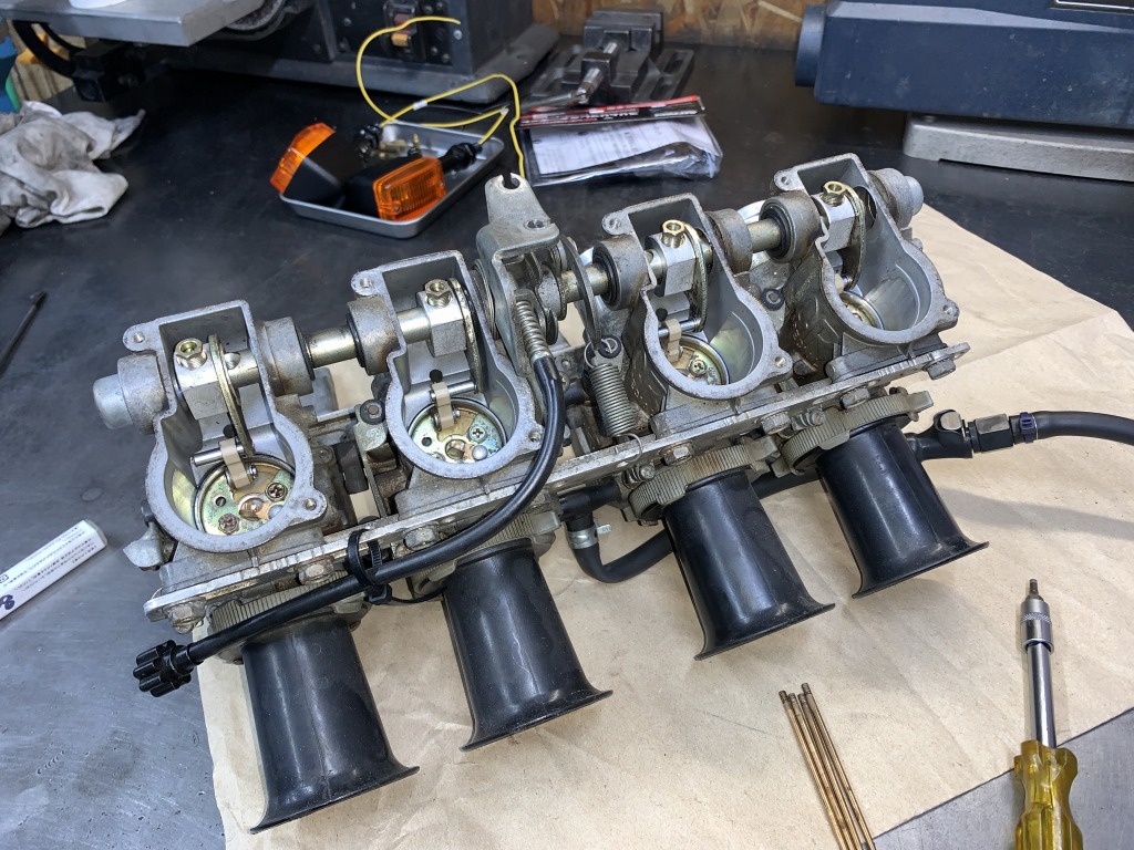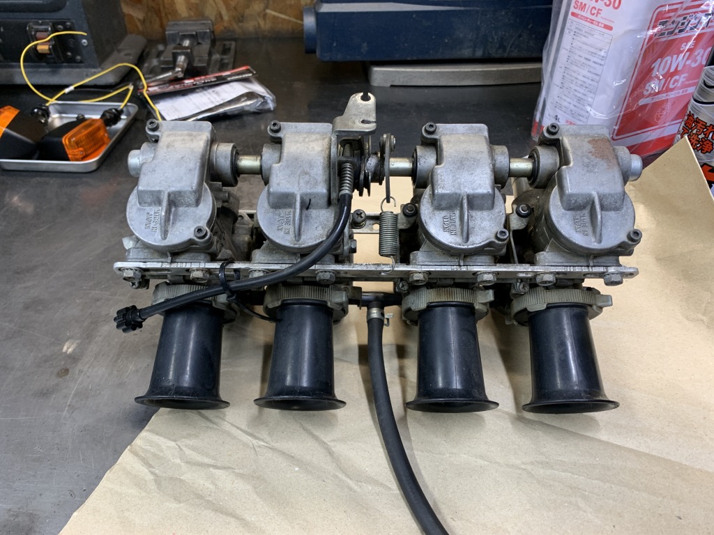 エンジンオイルを入れ、エンジン始動テストします。始動すると4気筒火が入り、比較的安定してアイドリングします。たまにバラツクのは燃焼室内のカーボン堆積の影響でしょうか。キャブセッティングを適正にし、少し高速走行してカーボンを飛ばせば調子が戻りそうですね。