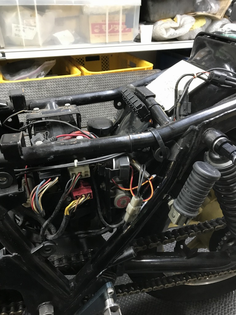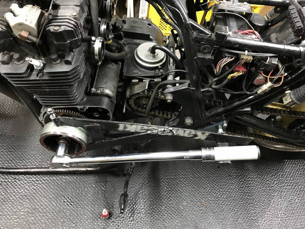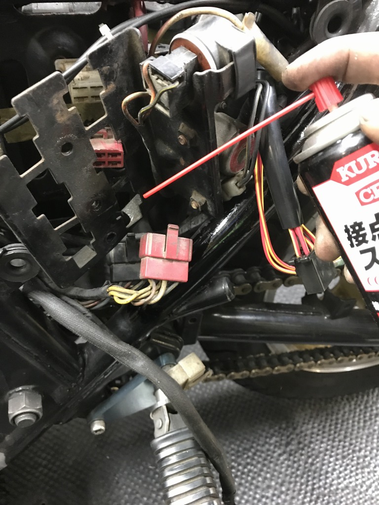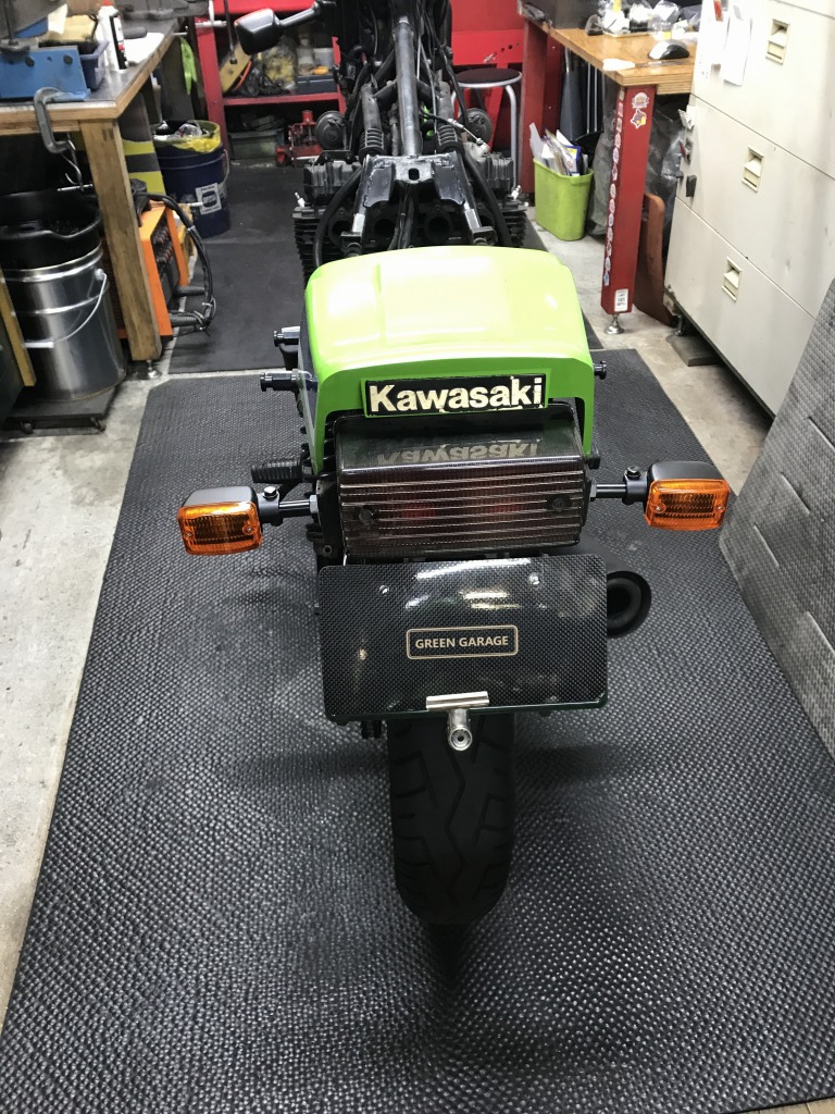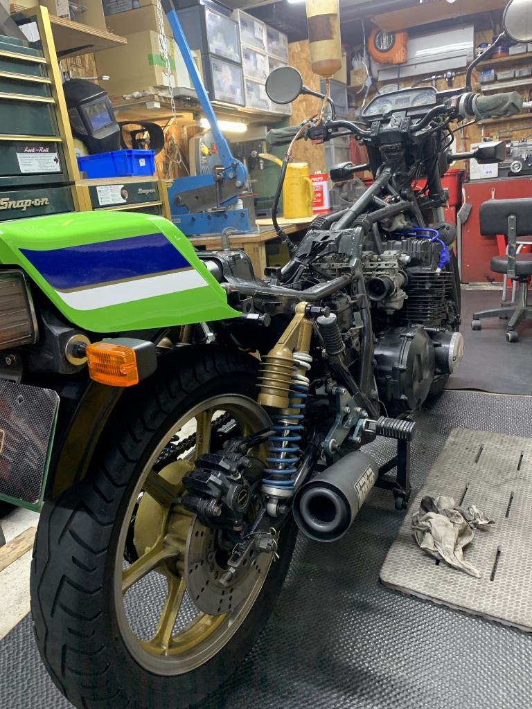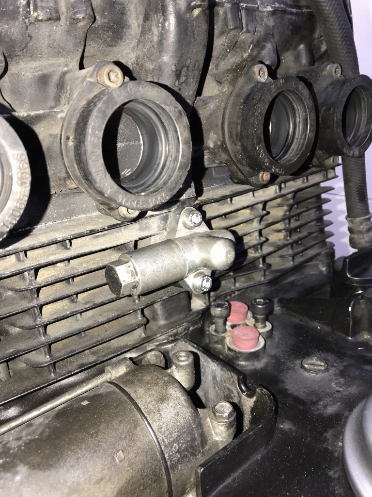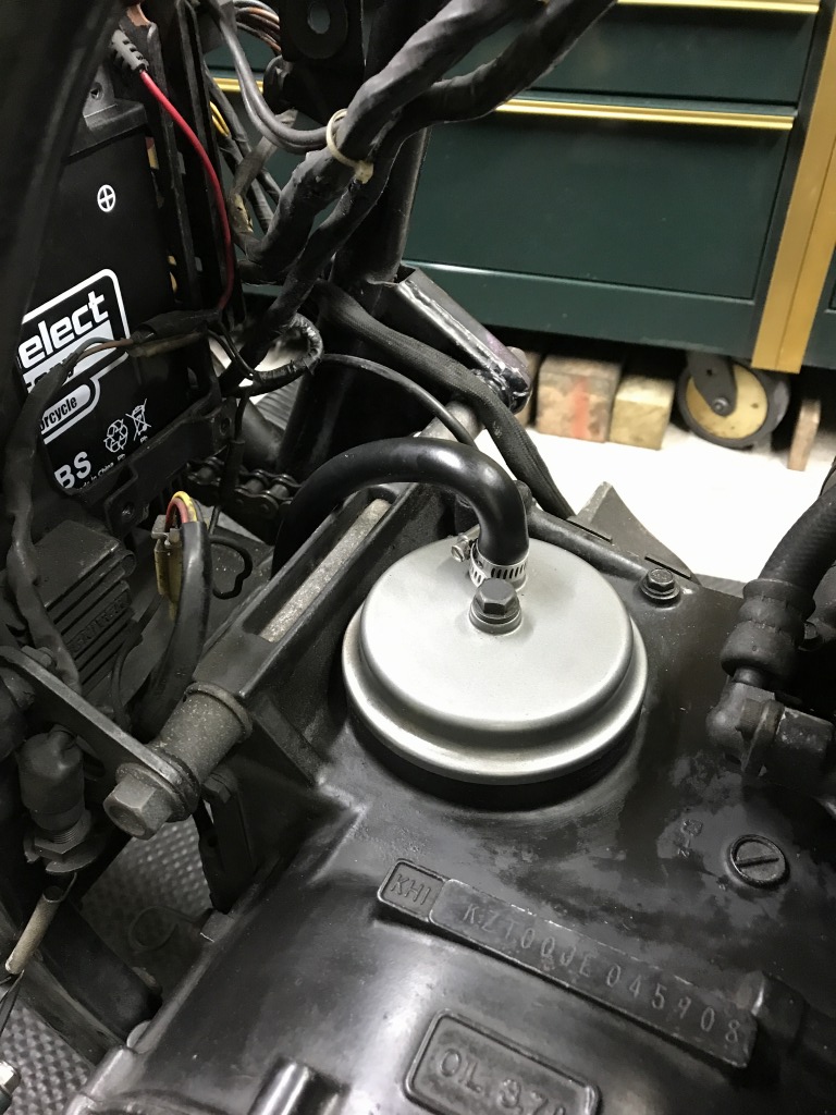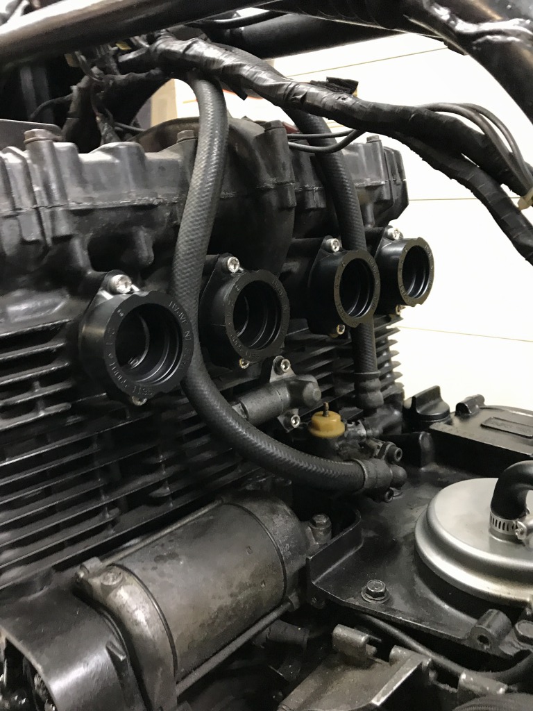 エンジンオイルを入れ、エンジン始動テストします。始動すると4気筒火が入り、比較的安定してアイドリングします。たまにバラツクのは燃焼室内のカーボン堆積の影響でしょうか。キャブセッティングを適正にし、少し高速走行してカーボンを飛ばせば調子が戻りそうですね。