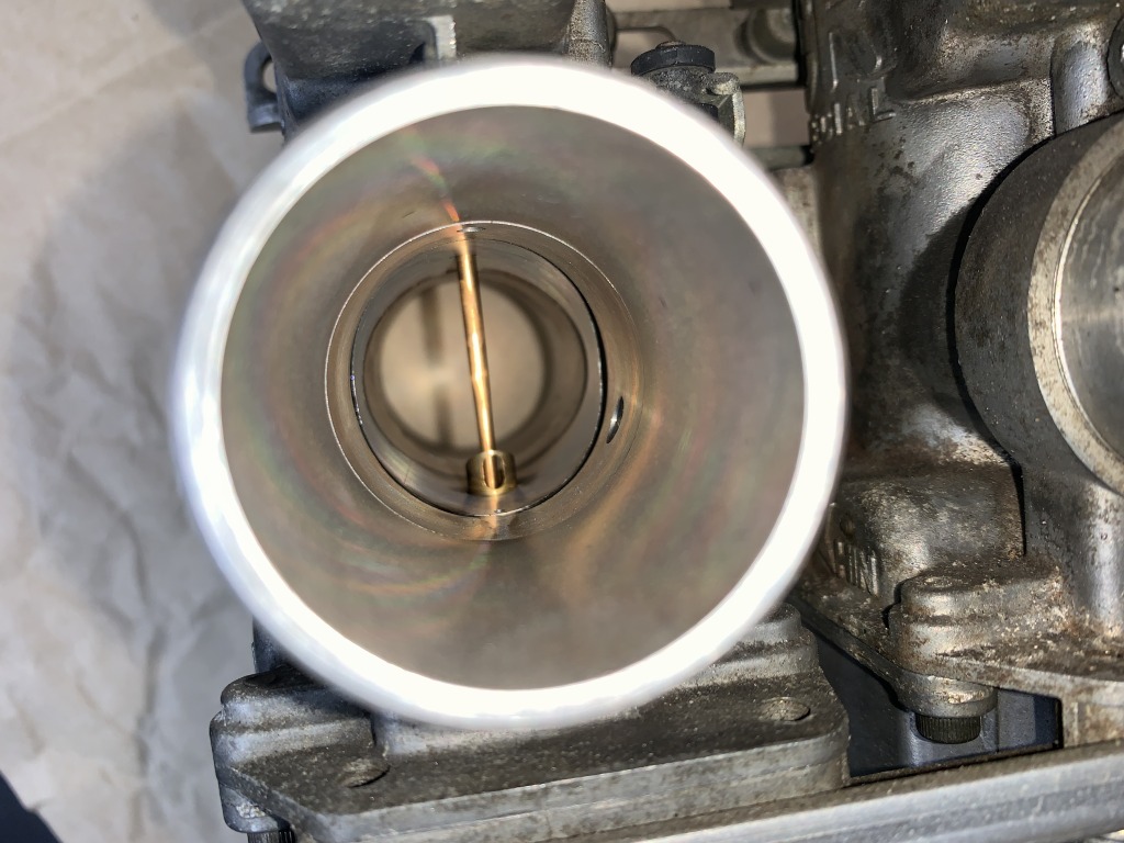 トップキャップも外して内部を点検します。ニードルはかなり細いので、こちらも標準的なサイズに変更します。やはりキャブセッティングはかなり濃いめにセットされていたことになりますね。