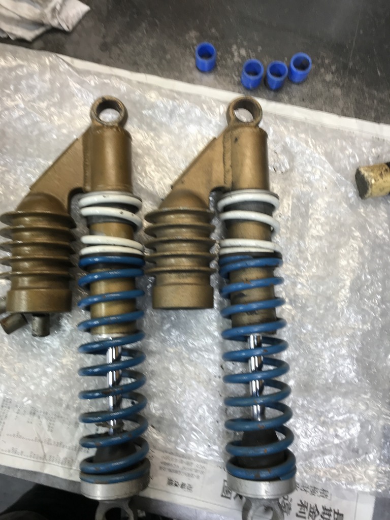 続いてリヤショックのブッシュを交換します。内径の合っていない青いナイロンのブッシュを外します。
