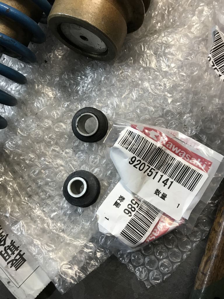 ワークスパフォーマンスにも使われているナイロンブッシュは耐久性がよくないので、ブッシュはゴム製に変更します。素材はカワサキ純正のこちらを使います。部品番号は92075-1141と92075-1586です。