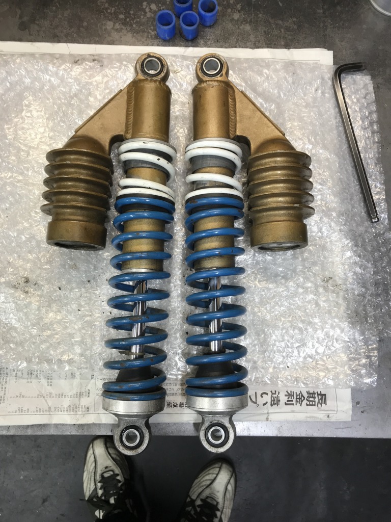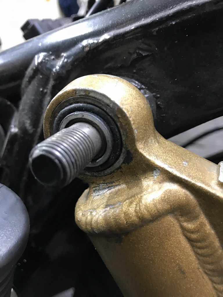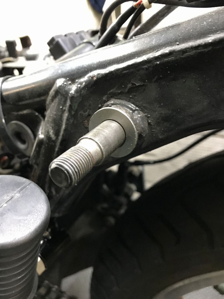 リヤショックのアッパーマウントは、フレーム側のピンが長いので奥に内径をピッタリにしたワッシャーを入れます。