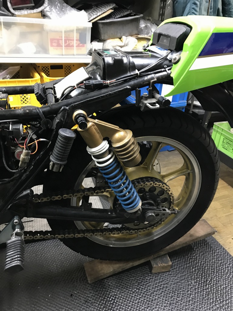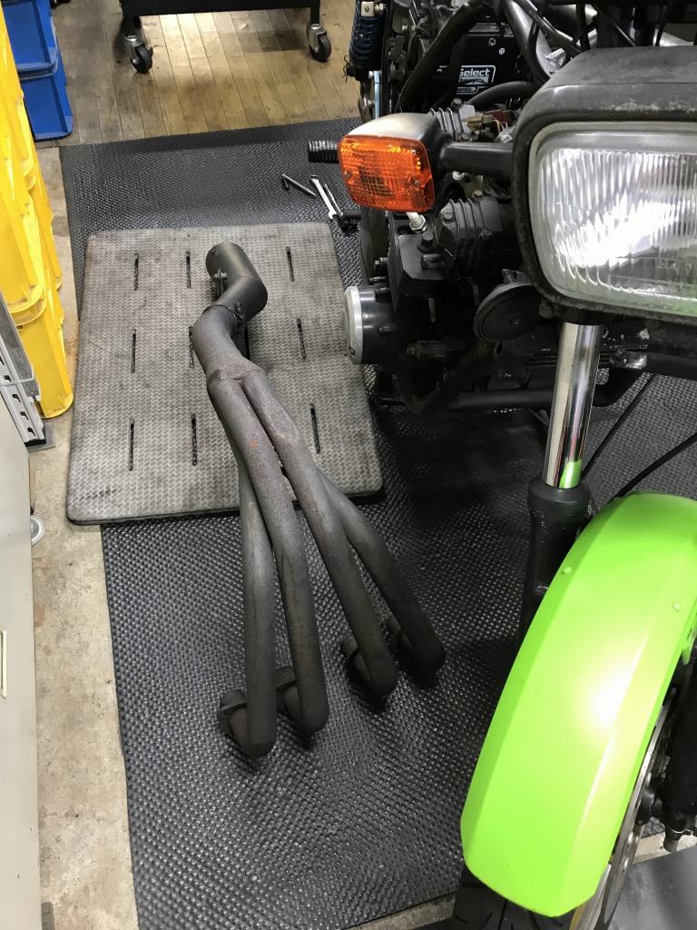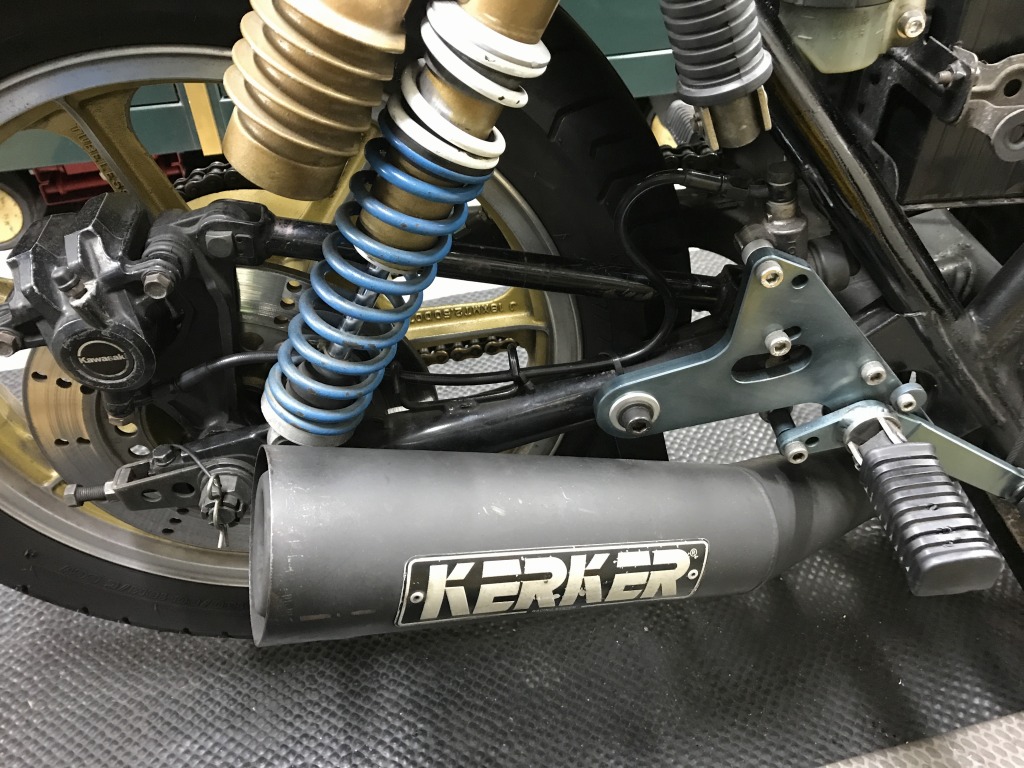 マフラーを取り付けます。リヤブレーキホースは取り回しをノーマルレイアウトに変更。
