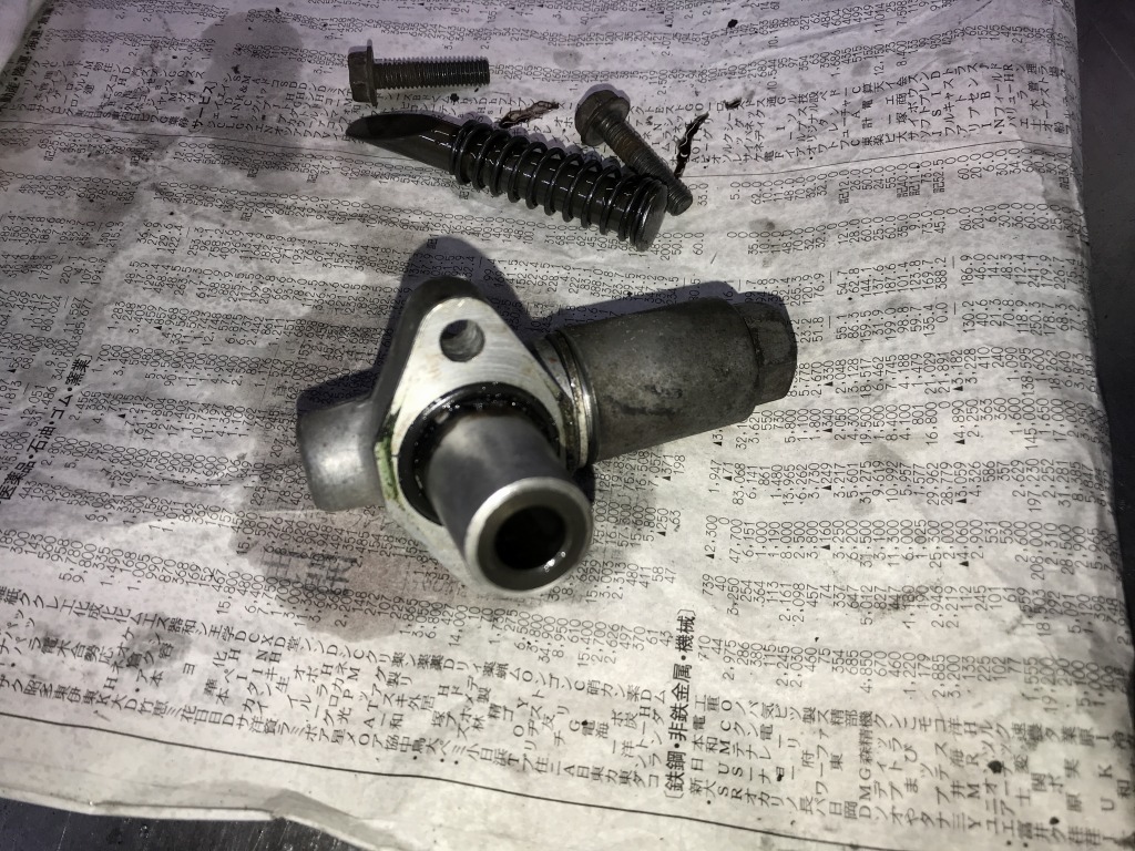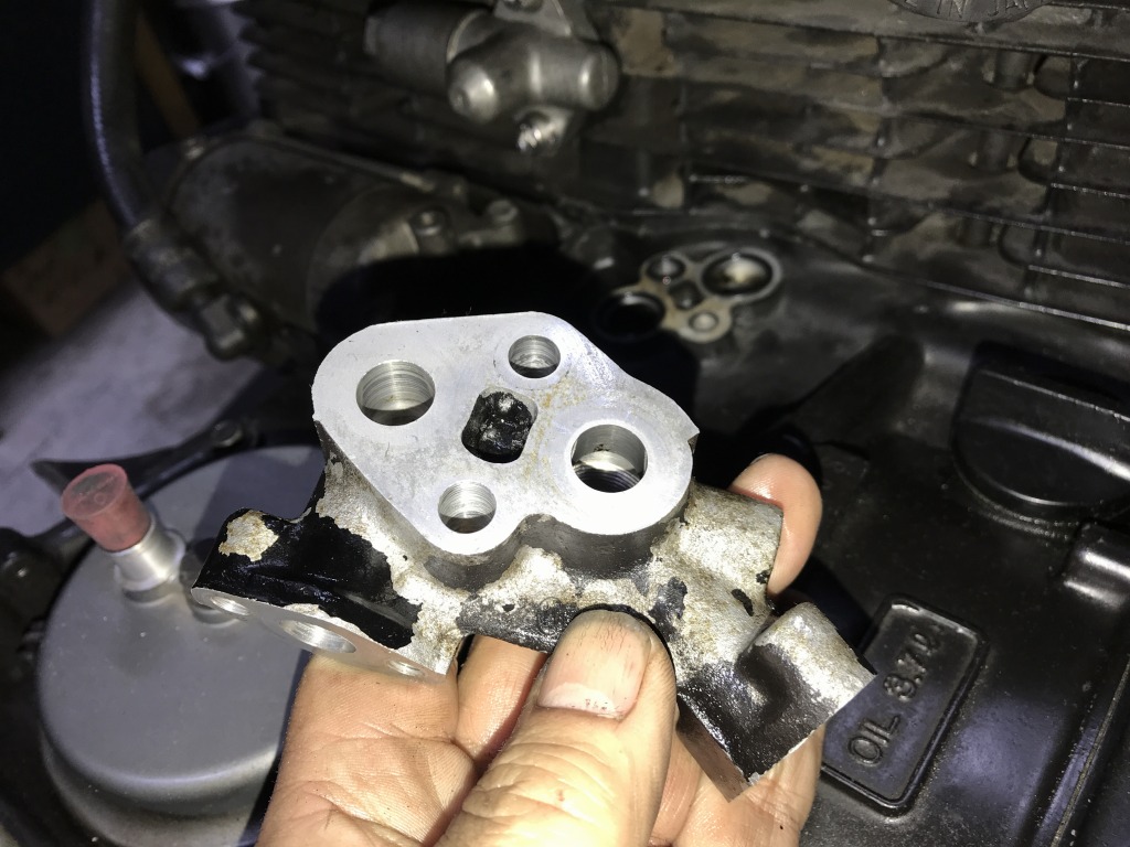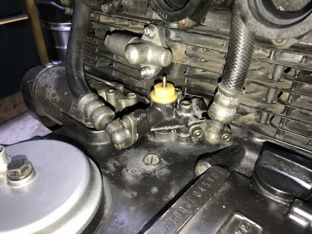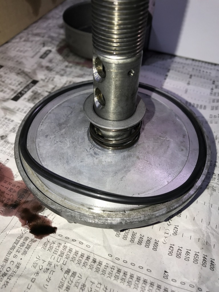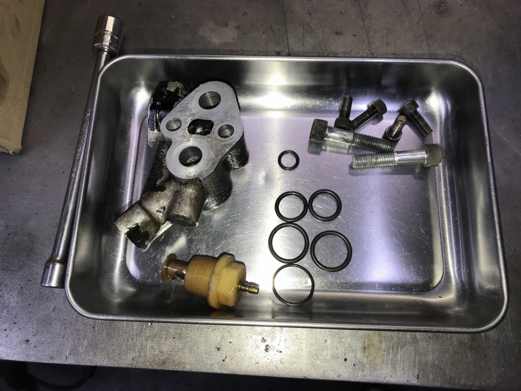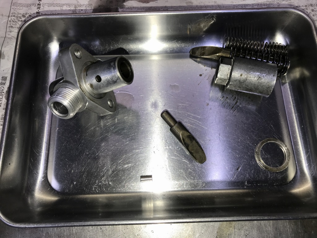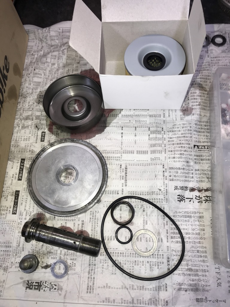 続いてオイル取出しを取り付けます。洗浄後、Oリングなどを準備します。