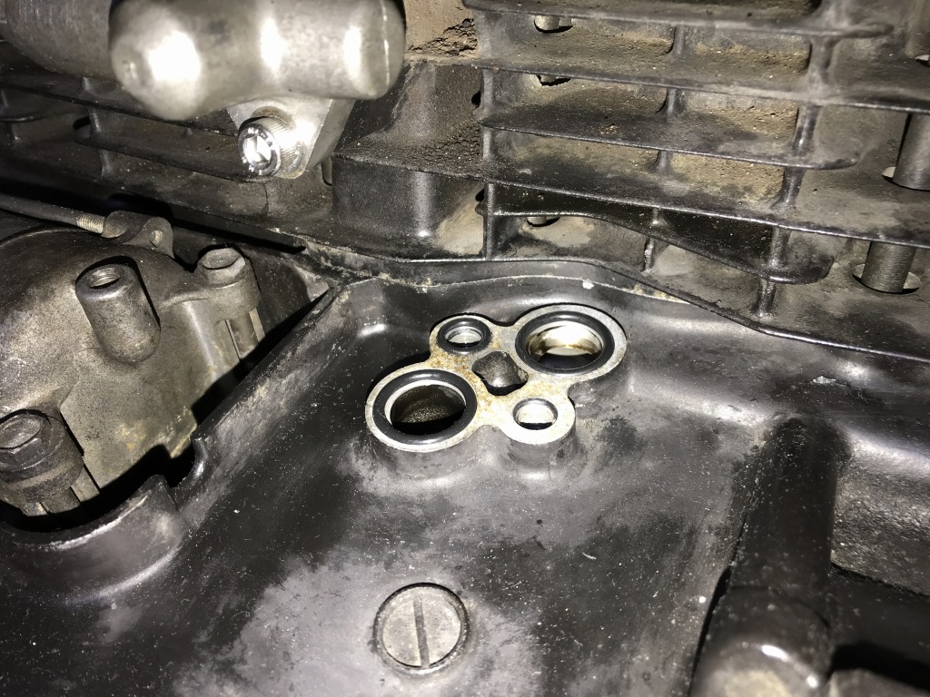 エンジン側にOリングをセットします。小さいOリングは、クランクケースによっては使わない場合もありますが、付くタイプはボルト穴がオイル通路と貫通しておりオイルが上がってくるのでシールが必要です。
