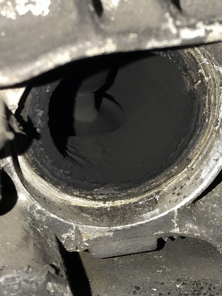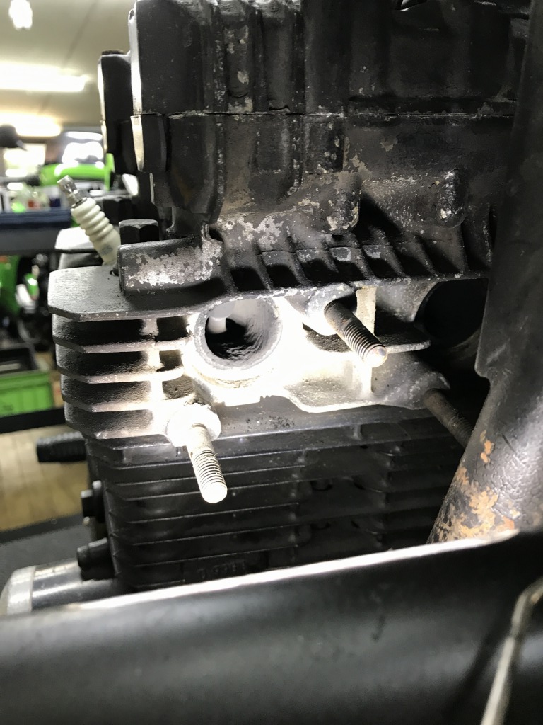 エキゾーストポート覗くと、ポート内はかなりカーボンが堆積しているのが解ります。ポート内径が狭くなるほど。