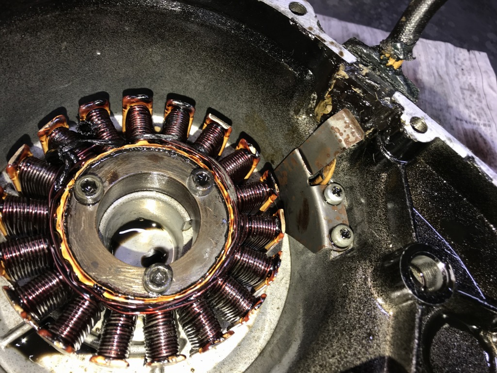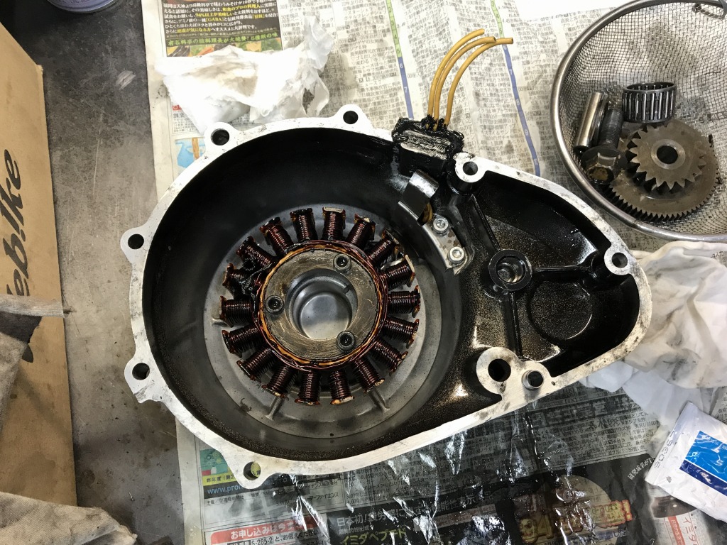 続いて、ジェネレーター周りのオイル漏れ修理です。グロメット付近がだいぶ傷んでいるようなので、交換すれば治りそうです。
