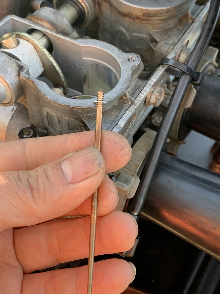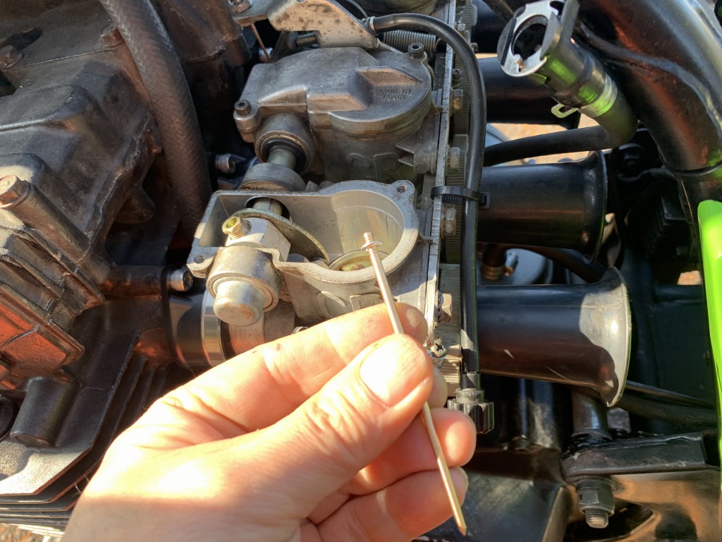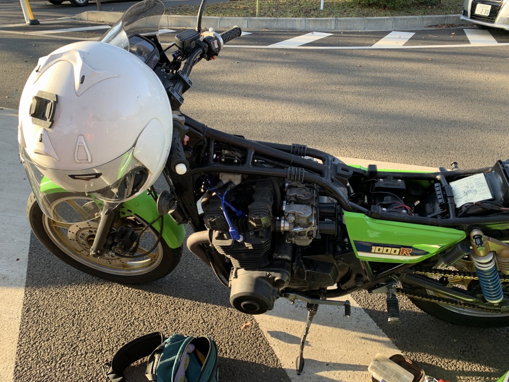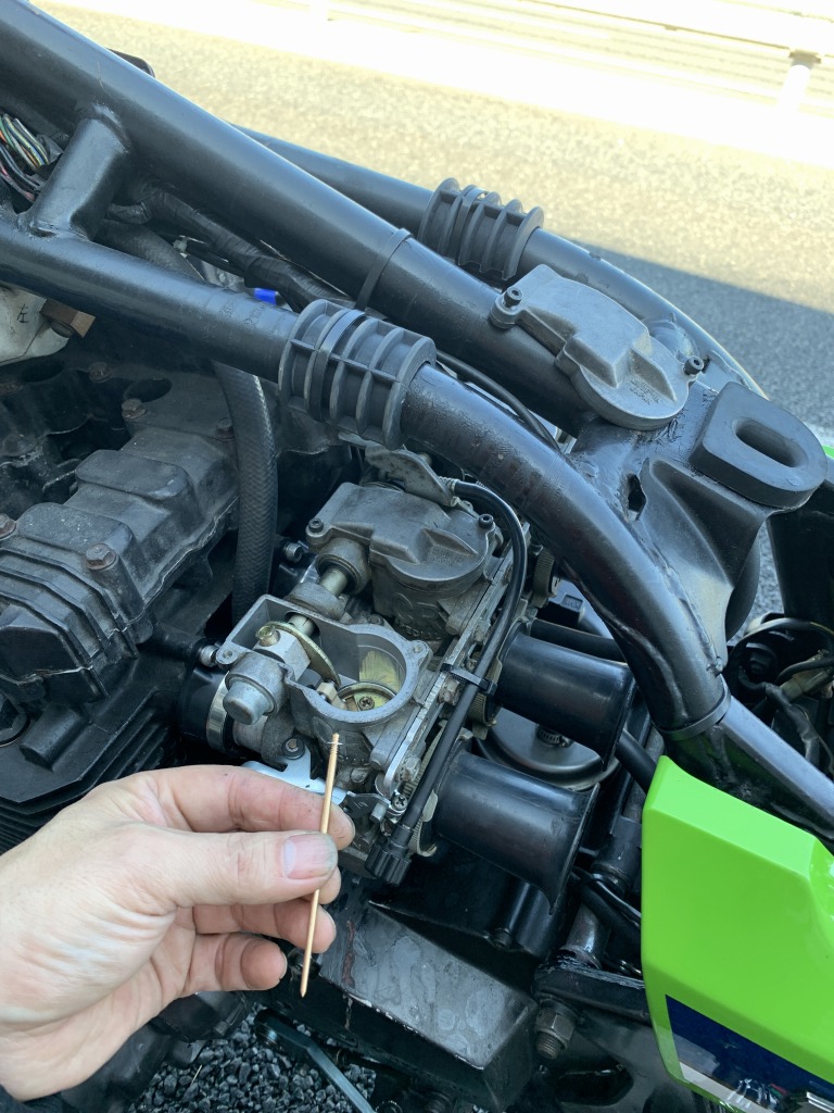 先ず、ガレージ周辺でスロットル低開度のセッティングを進めます。エアスクリューを動かしたときの反応が鈍いので、不調の原因がなかなか絞り込めません。