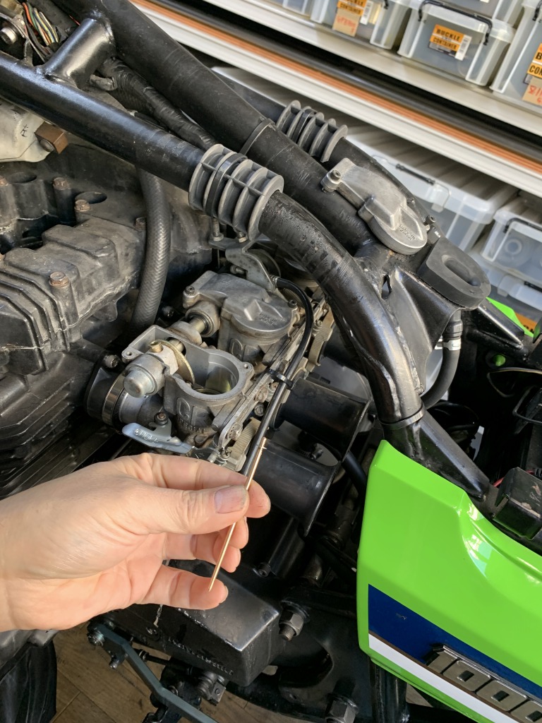 エンジン不調で入庫したこちらの車両、点検の結果は点火系などには特に異常は見られませんでした。キャブのセッティングがかなり濃いめにしてあり、エキゾーストポートやプラグのカーボン堆積がかなり多かったので、不調の原因はキャブセッティングにありそうです。