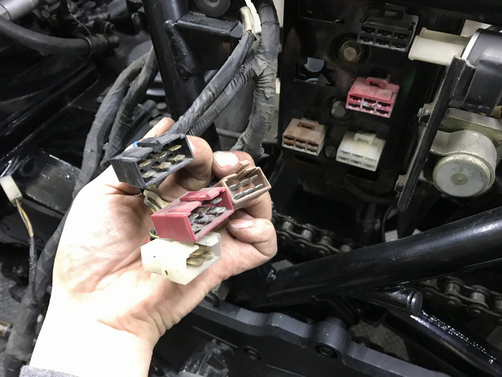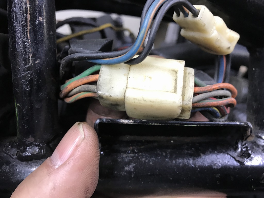 メインハーネスとハンドルスイッチの接続コネクターです。変形しているので、端子の腐食による接触抵抗で発熱し、溶けたものと思われます。外せないのでハーネスを切断します。