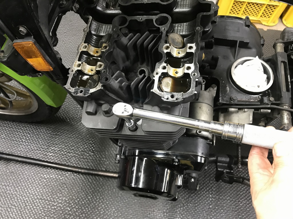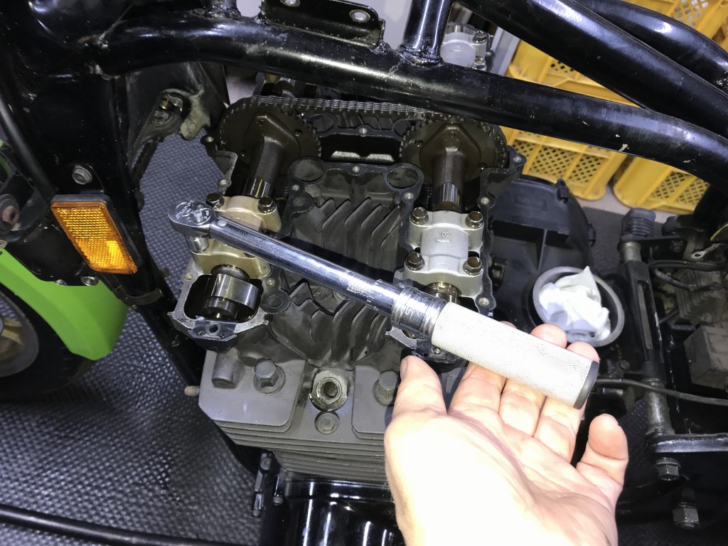 カムホルダーネジのトルクを確認します。半分は増し締めできて、1本はトルクが掛かりません。全部ヘリサート加工した方がいいでしょう。