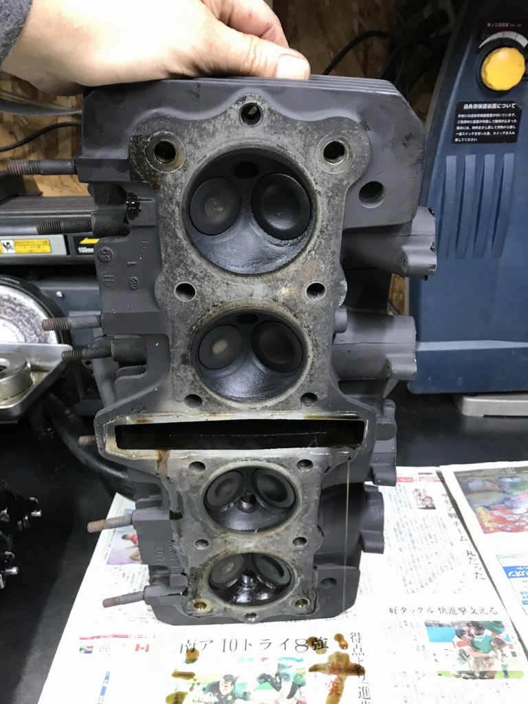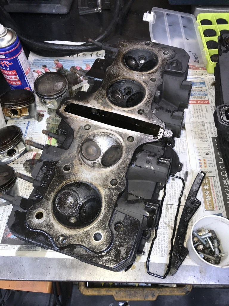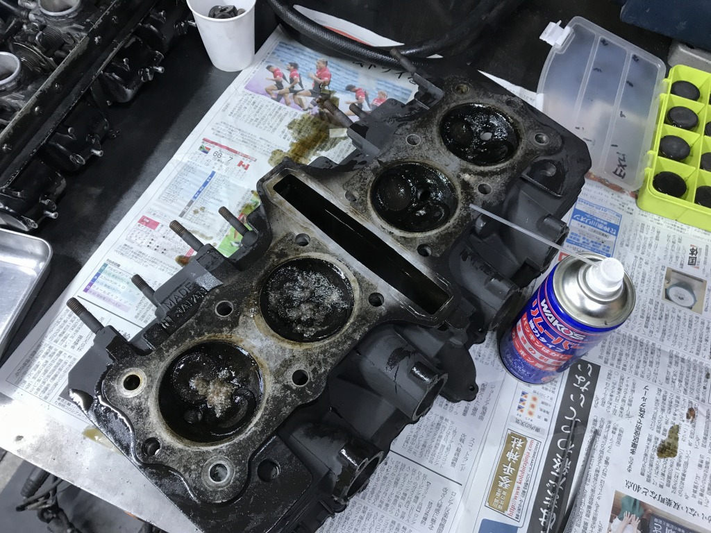 ヘッドを外します。ピストンはノーマルのΦ69.4ミリでした。ヘッドガスケットはノーマルではないので、エンジン分解歴があるようです。