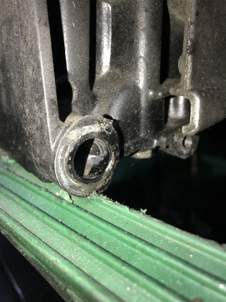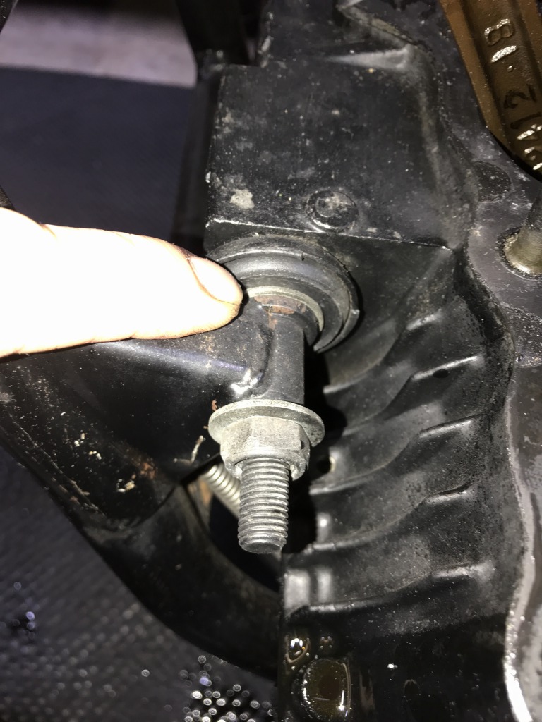 上下反転したエンジン腰下です。左下のリヤ側エンジンマウントをみると、端面がかなり摩耗して変形しています。