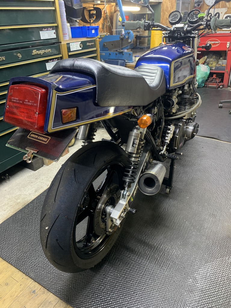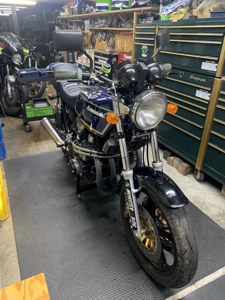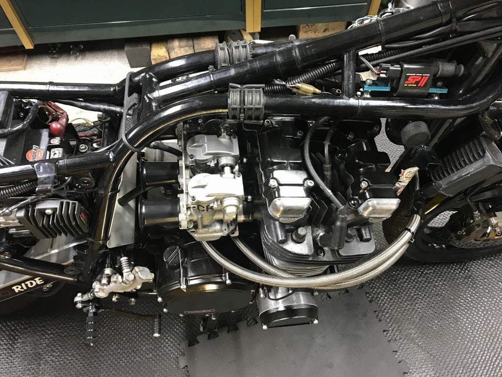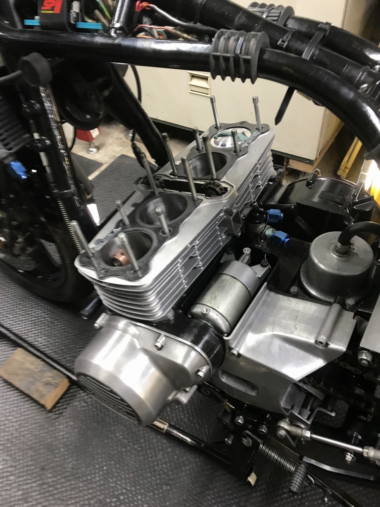 マフラーを取り付け、始動確認して一応完成です。このあと走行チェックし、問題無ければオーナーさんにエンジンの慣らし運転を300キロ程していただき、その後キャブセッティングします。