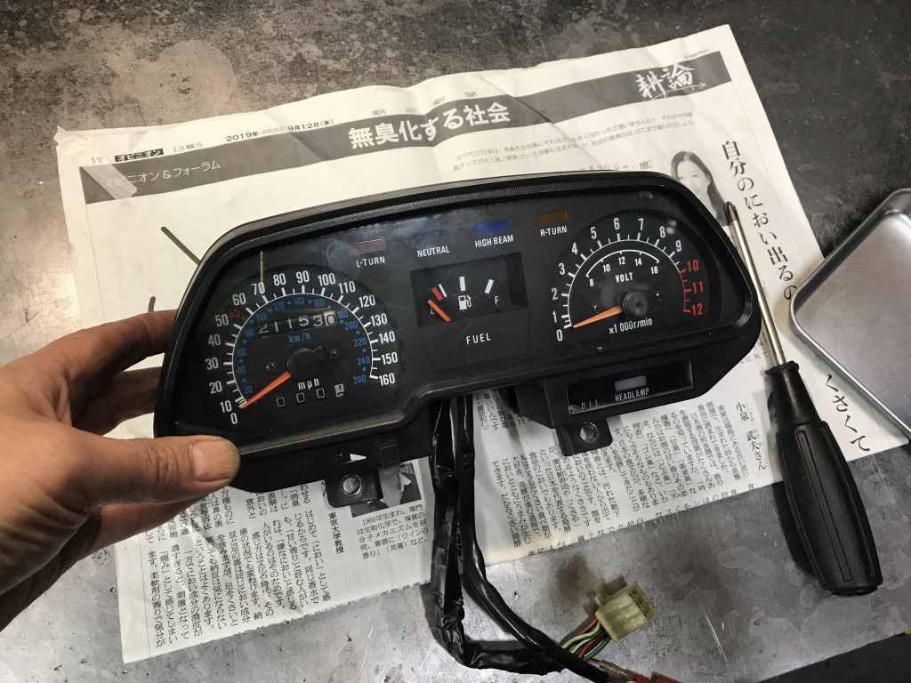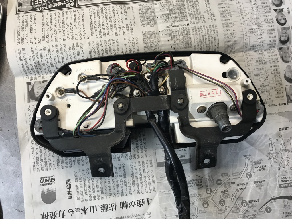 分解すると内部のダンパーが欠品しており、4点止めのところ2点止めでした。ドナーのメーターから部品を調達します。