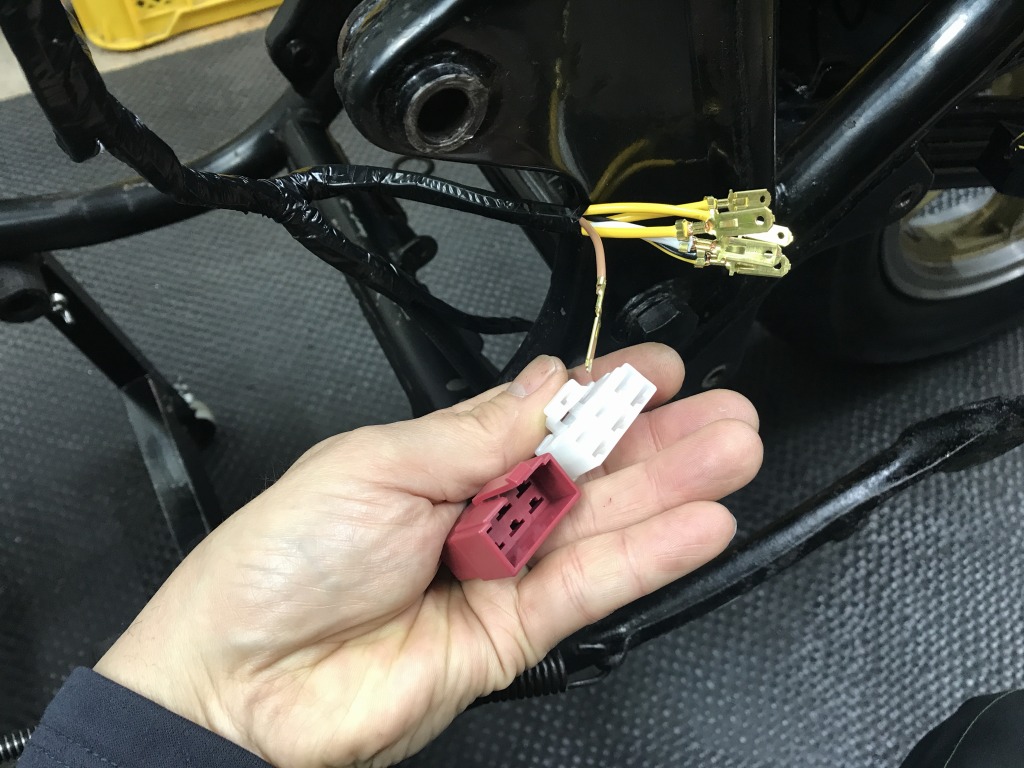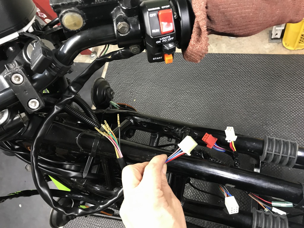 端子をメスに交換し、端子配列もゼファー750用に並び替えて接続します。