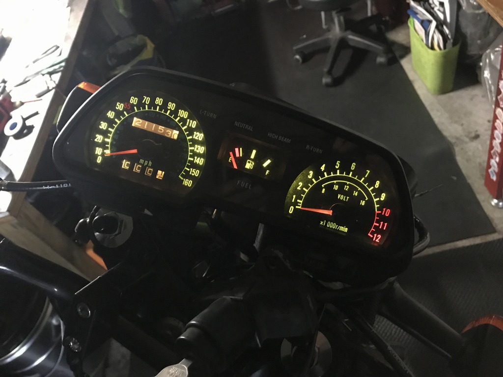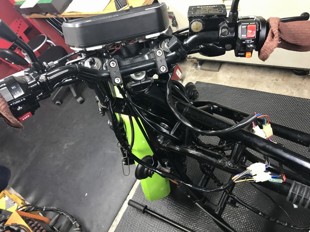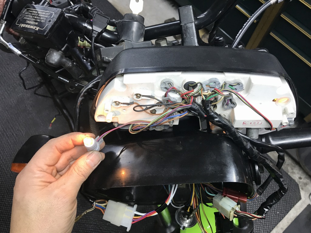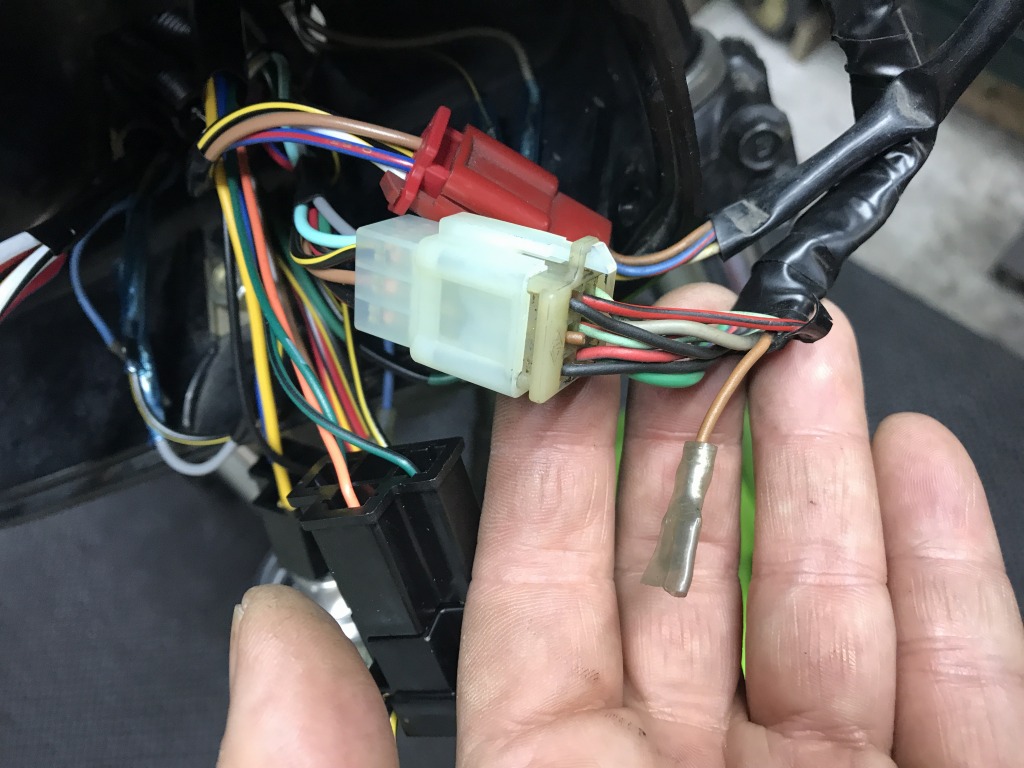 ニュートラルランプが点かないので調べると、メーターの配線が改造されていました。これを元に復元してOKとなりました。