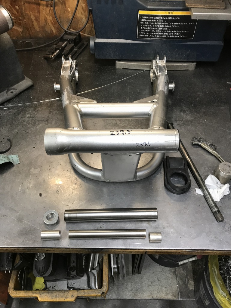 ピボット部分はカラーを2ミリほど詰めて幅を狭くします。内径はZRX400のφ20ミリからJ系のφ16ミリにアダプターで落とします。