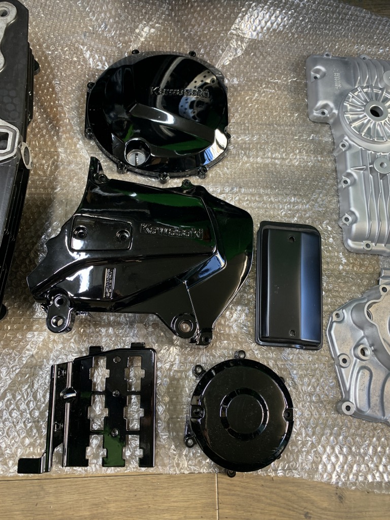 エンジンのセラコートが完成しました。純正の仕上がりに合わせるため、部位によってツヤ消しブラック、ツヤありブラック、ウエットブラストのみと使い分けます。