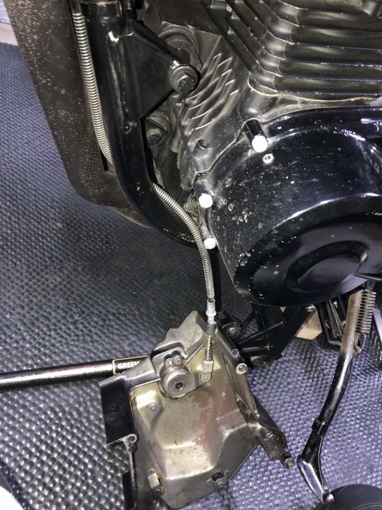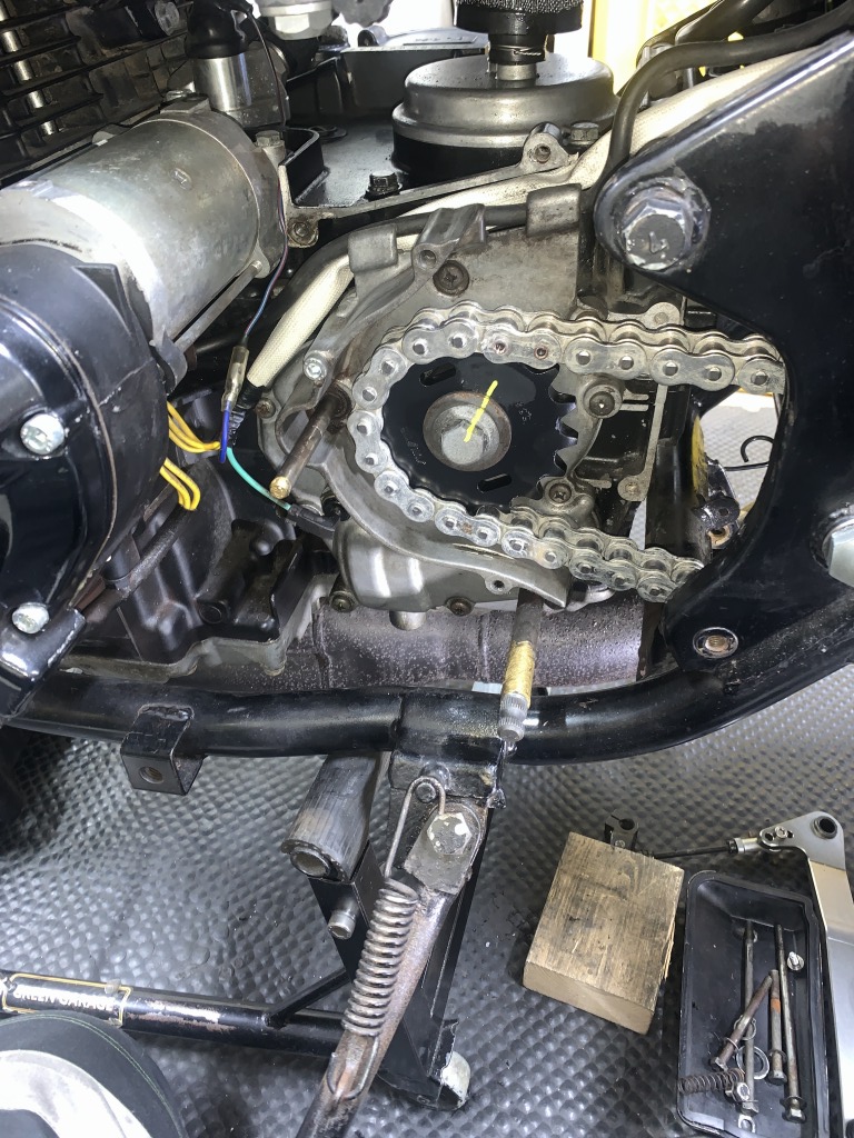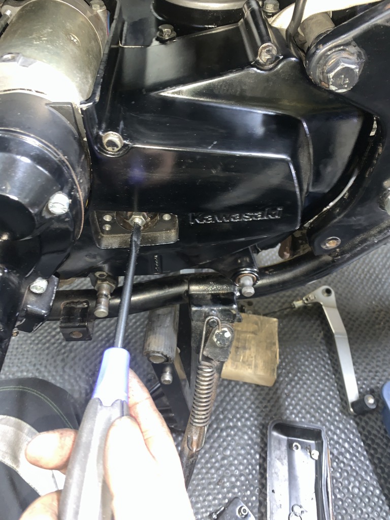 スプロケカバーを外します。クラッチケーブルはルートが間違っているのでハンドルを切ると突っ張ってしまいます。これは正規のルートに直します。