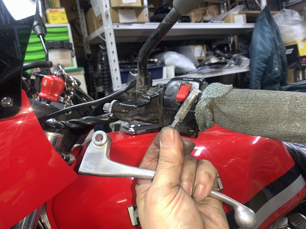 クラッチレバーは動きが渋いので分解点検します。ボルトはグリスが切れていたのでグリスアップして組付けます。ケーブルにはエンジンオイルを注しておきます。