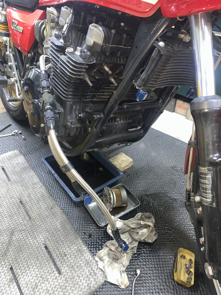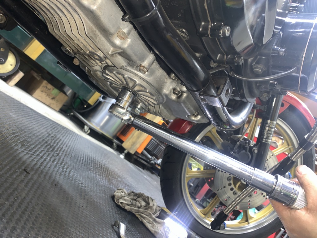 続いてエンジンオイルを交換します。マフラーはオイルラインに干渉して外れないので、オイルラインも外します。