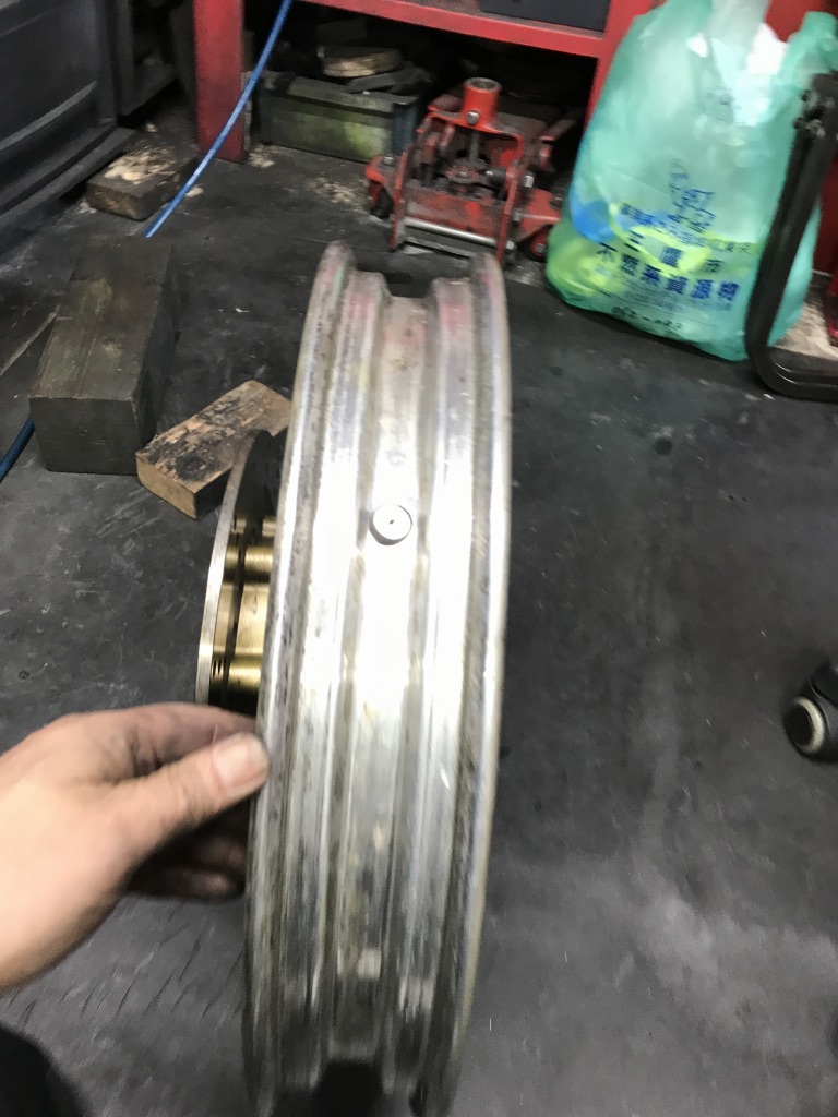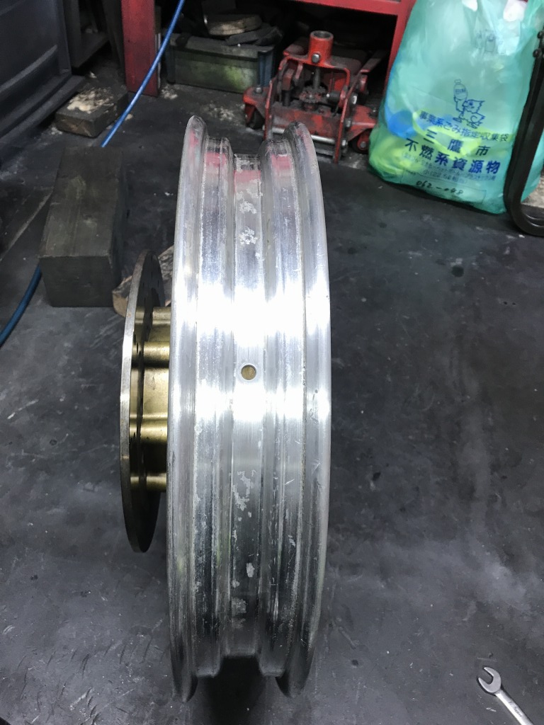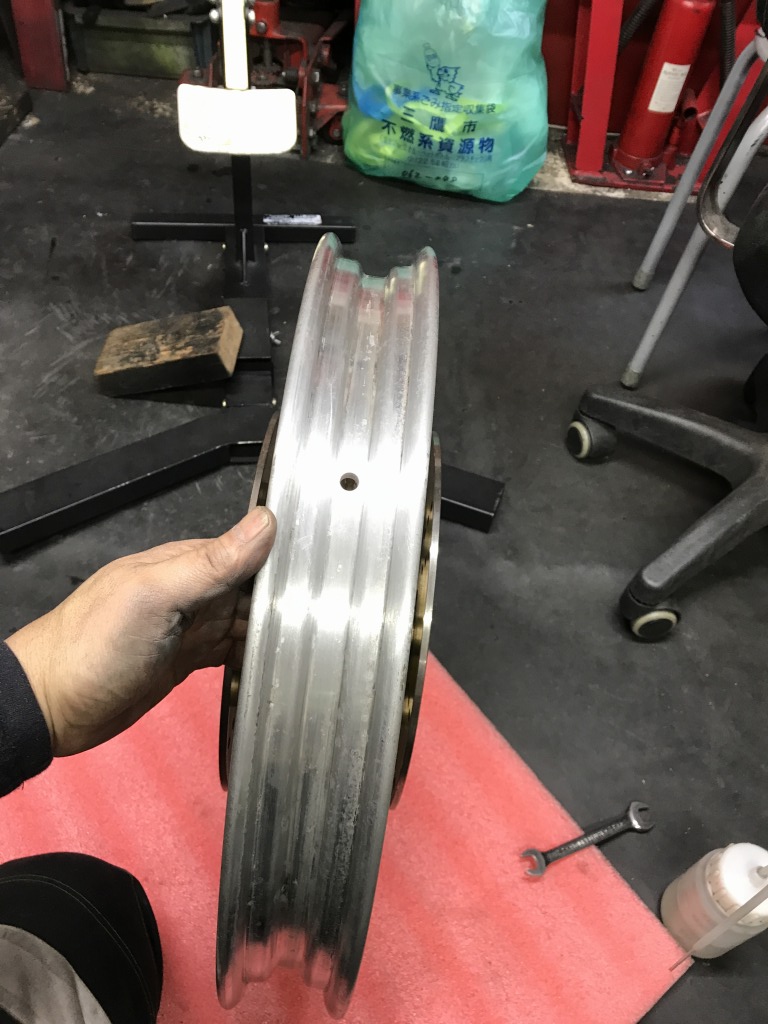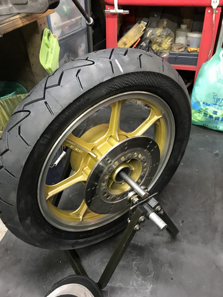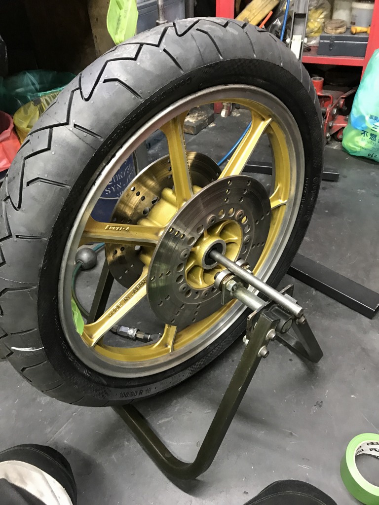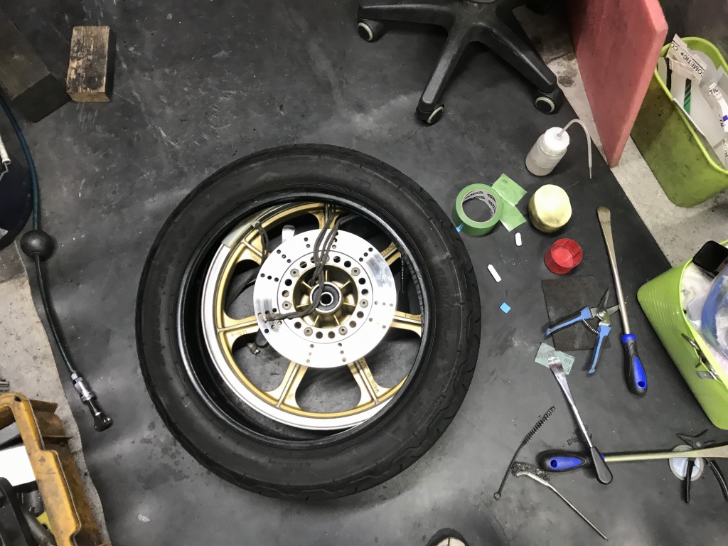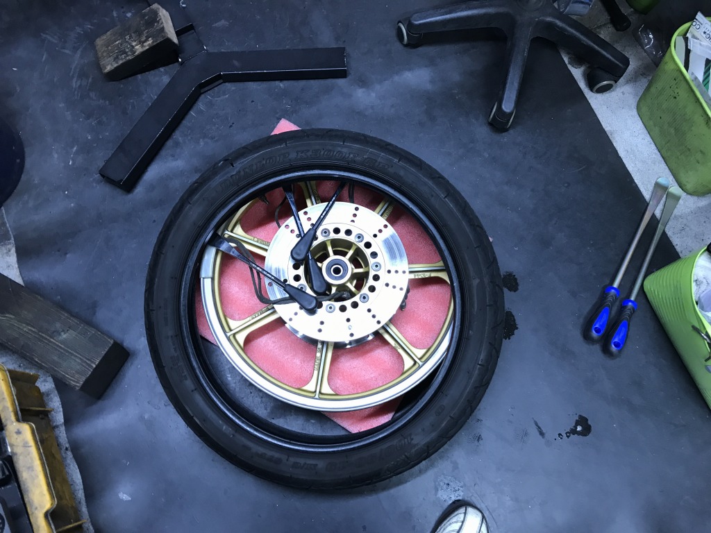 先ずはタイヤ交換します。フロントタイヤはスローパンクチャーがおきているとのこと。