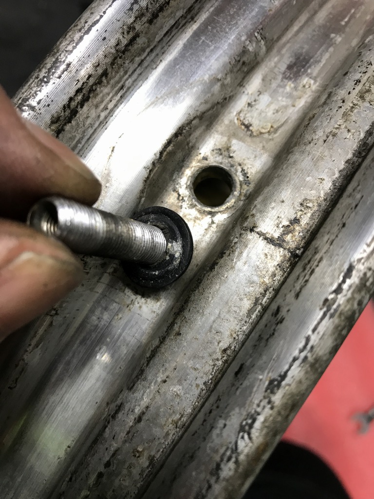タイヤを外してみるとリムの内側はかなりタイヤカスなどで汚れたままです。バルブからの漏れは無かったので、この汚れが気密性を損なっているようです。