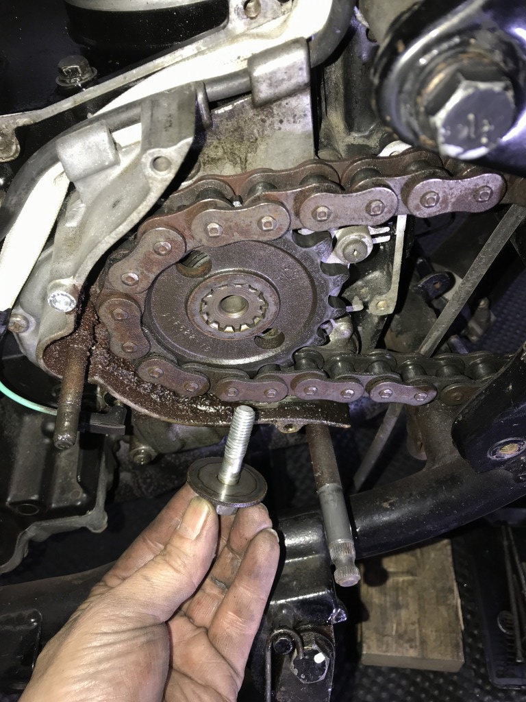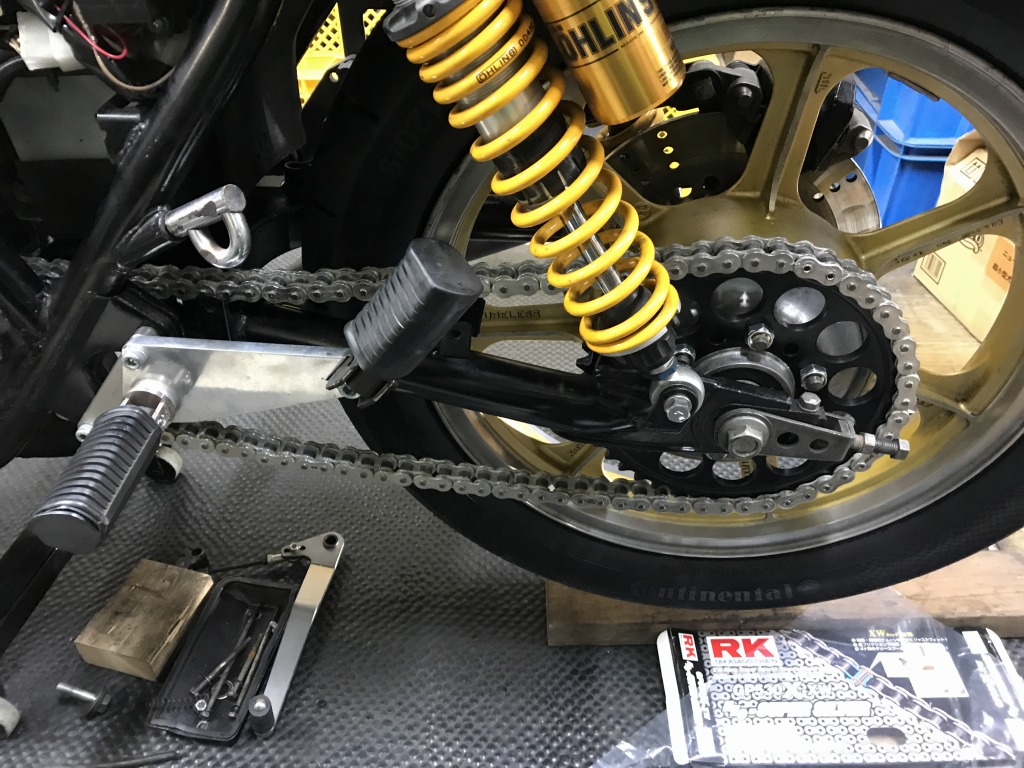 新しいチェーンを取り付けます。今回はサイズダウンして530です。ギヤ比はノーマル並みの15×44Tです。