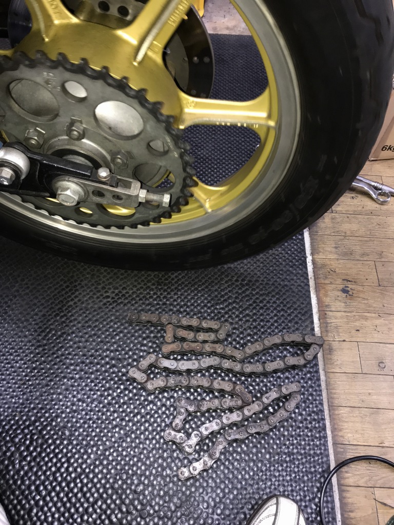 チェーンを交換するので切断して外します。630のこのチェーンは、リンクのいたるところが固着して渋くなっています。チェーンは数百キロごとのこまめなメンテナンスが必要な重要部品です。