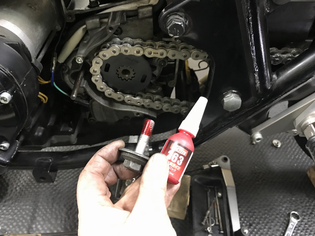フロントスプロケボルトは、強力なネジロックを塗布して組付けます。