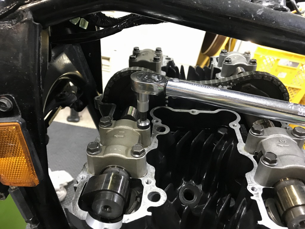 バルタイを合わせてカムを組み込み、問題無いかレンチでクランキングして確認します。