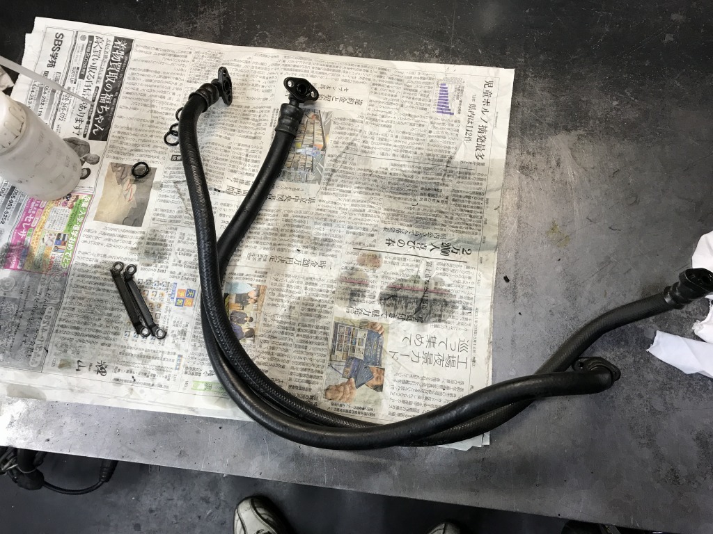 純正のオイルクーラーホースを点検して組み付けます。