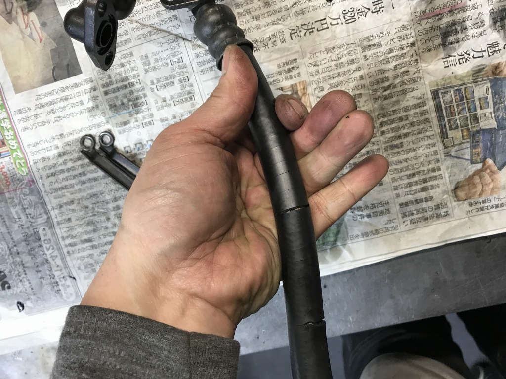 メッシュの外側の外皮は数ヶ所クラックがありますが、純正ホースは希少品なので簡単には交換できません。漏れはないので継続して使用します。