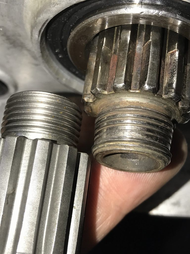 スプラインの摩耗も多いですが、それよりネジ山が半分ほど無くなっているのは致命傷です。