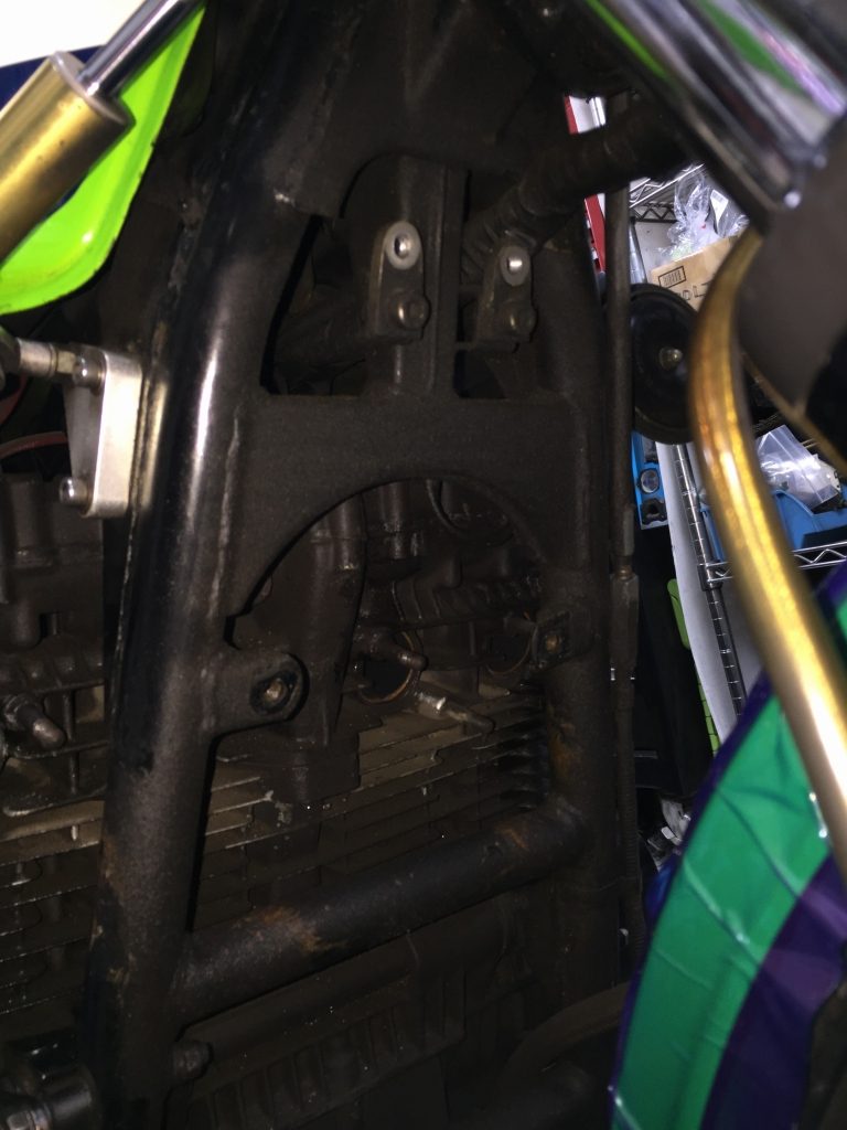 オイルクーラーのステーがメインハーネスに食い込んでいます。