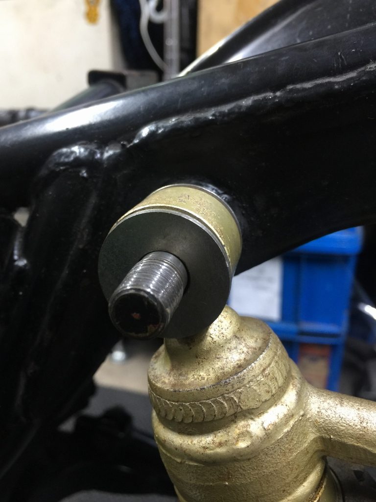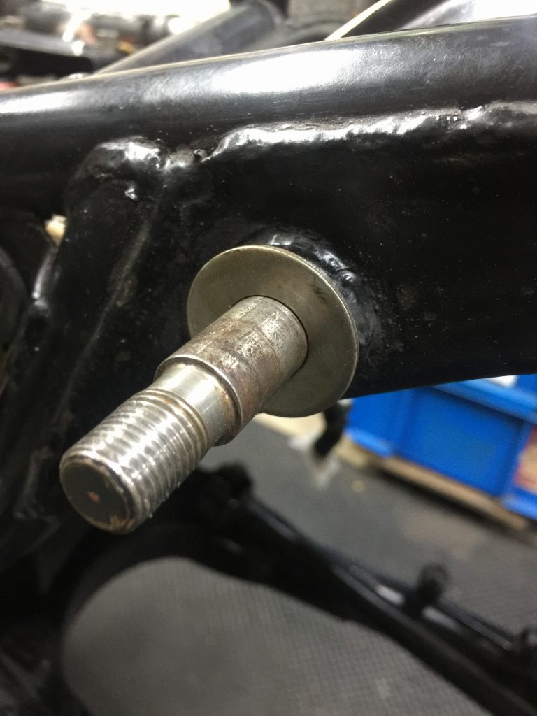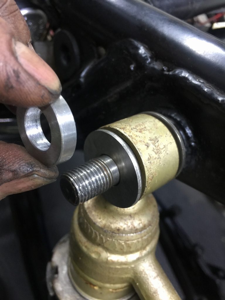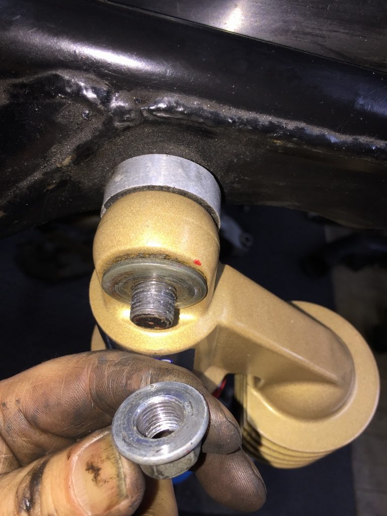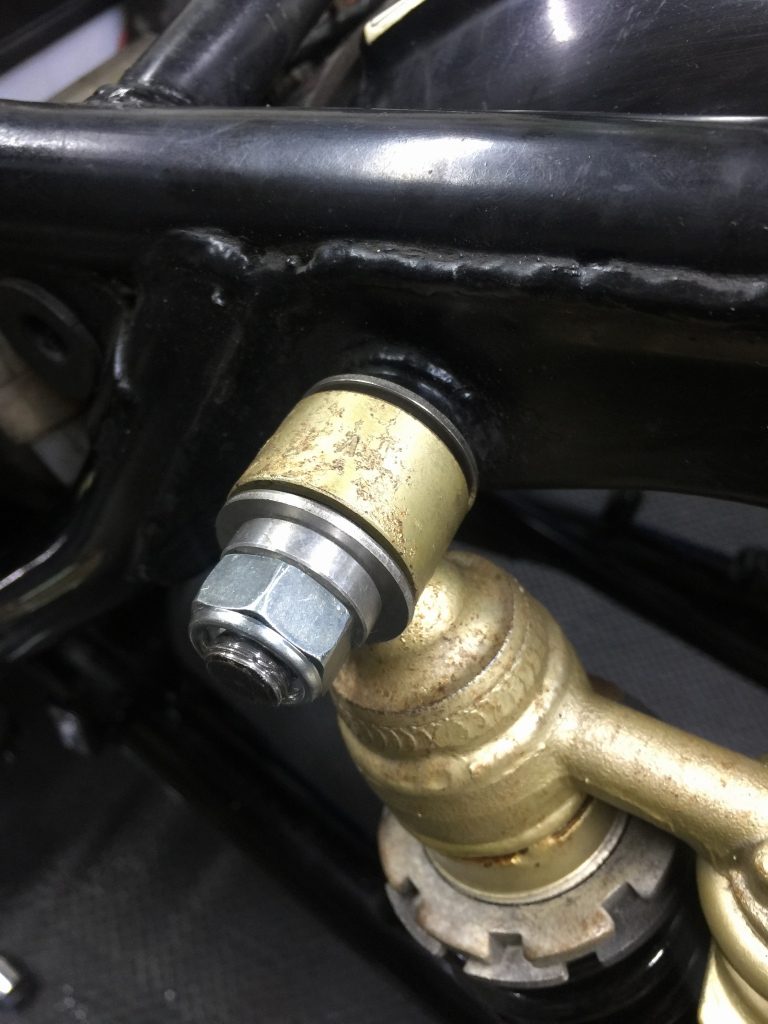 そのままリヤショックを付けると、アッパーマウントのフレーム側段付きが飛び出すので、ブッシュのインナーカラーを締め付けできません。