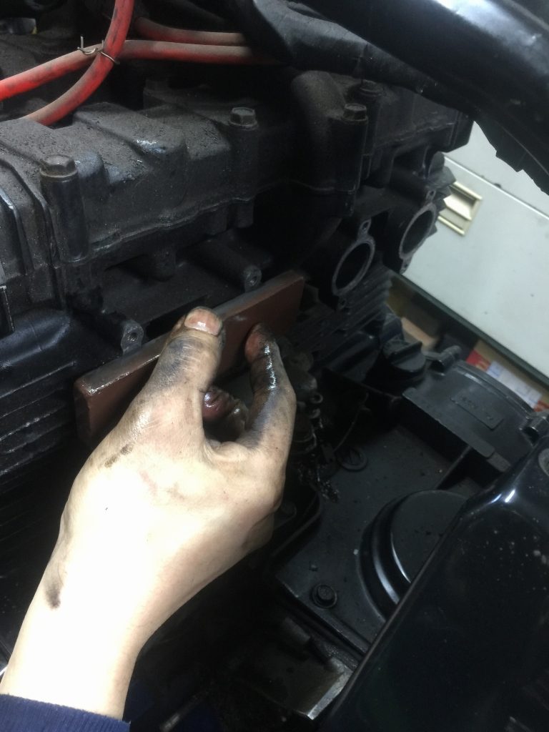 取り付け面の汚れを落とし、オイルストーンでマニホールドの面出しをします。