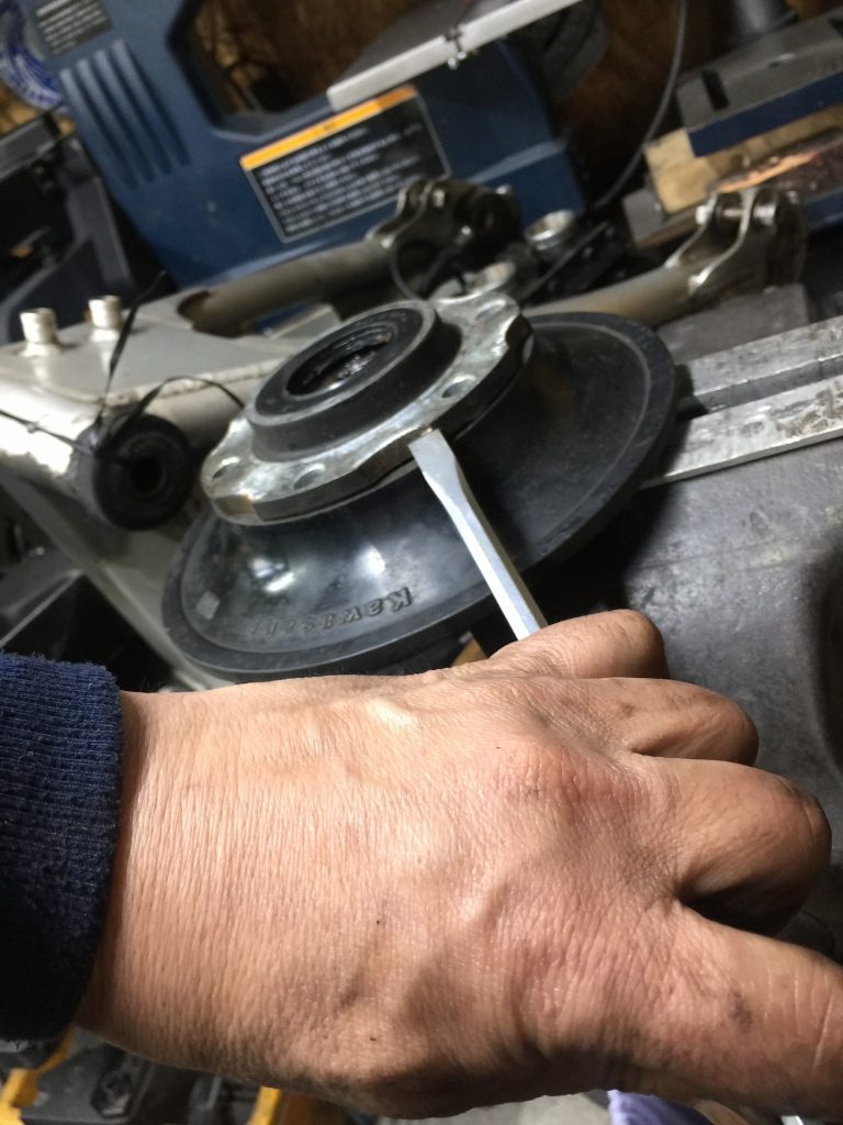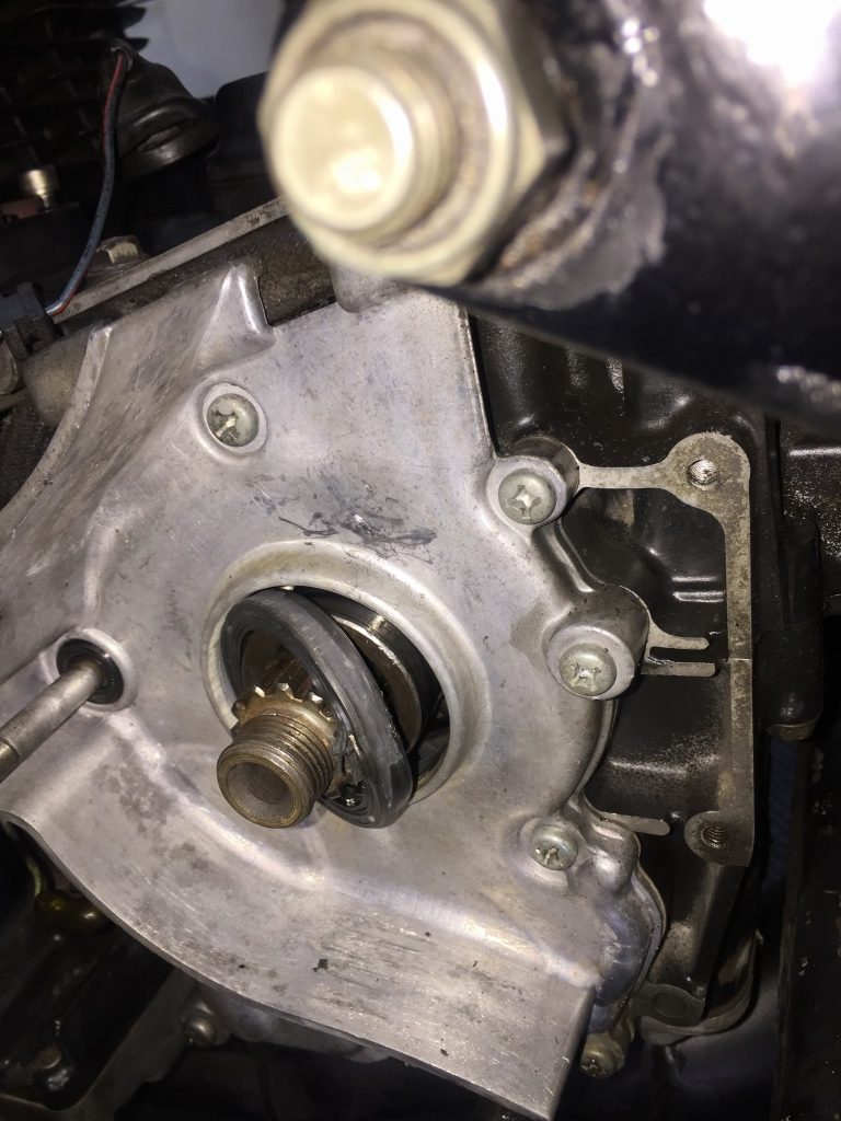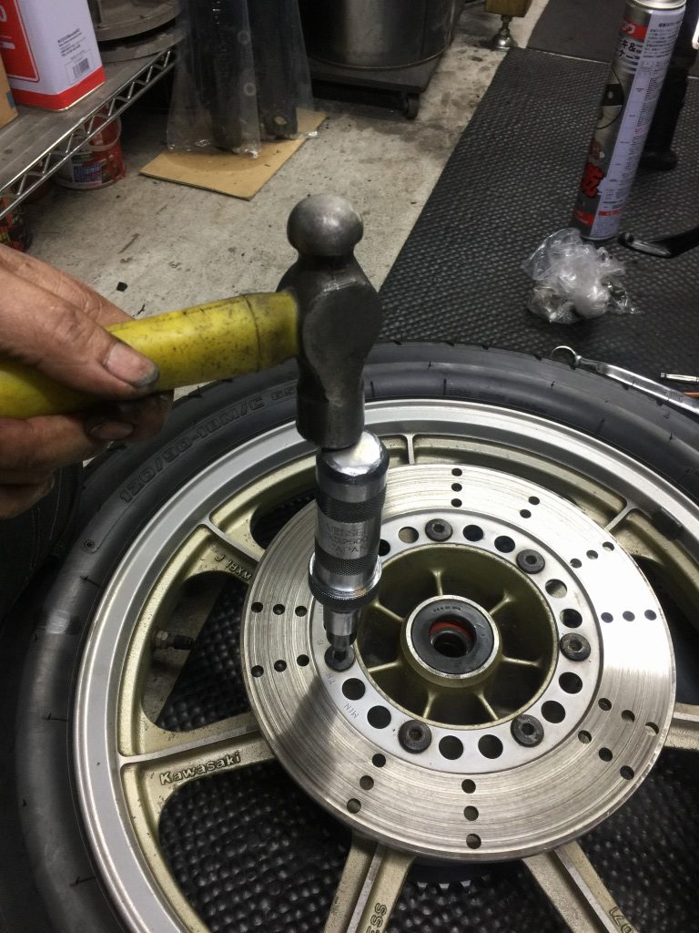 新しいオイルシールを装着し、スプロケとそのナットを使って締め込み、圧入します。