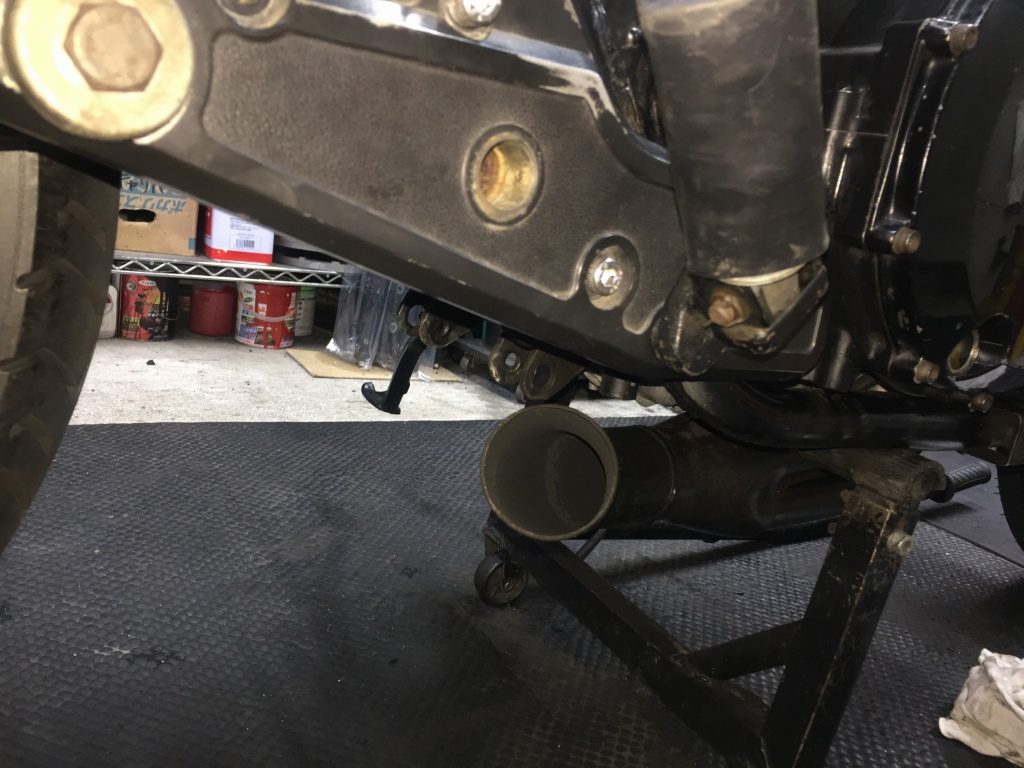 ステップとスイングアームなども交換するのでマフラーを外します。