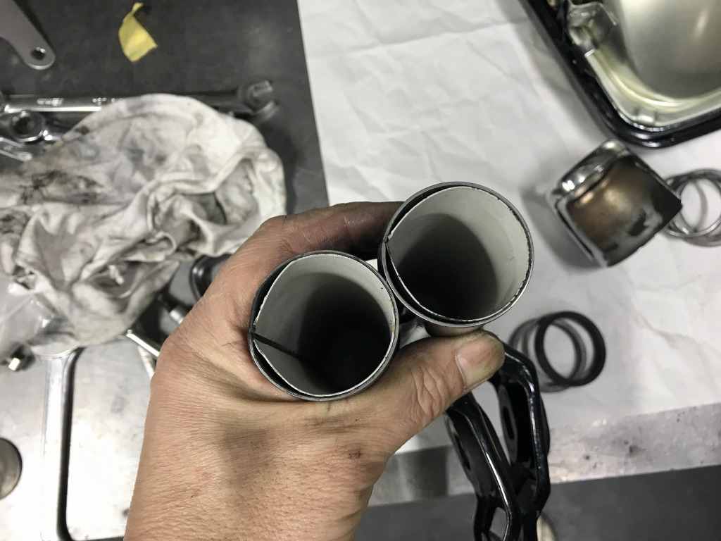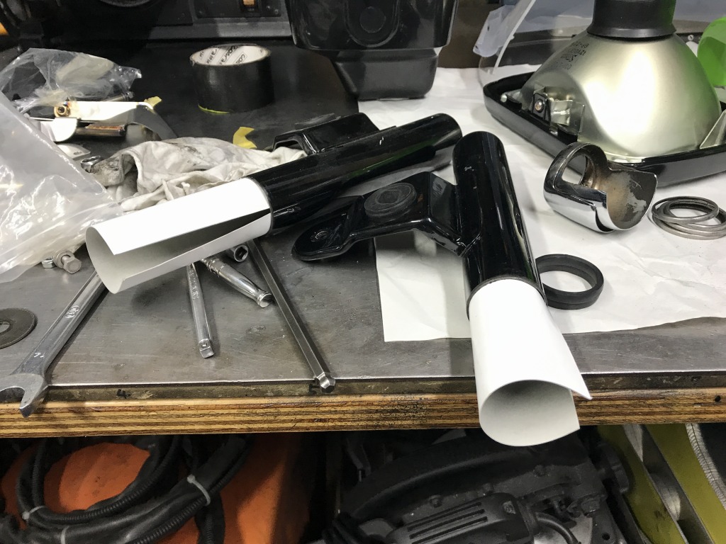 R1のヘッドライトステーには上下に子部品がありますが、希少なので今回はありません。代わりにぐらつき防止のため、筒の中に厚紙を丸めて挿入し、内径を補正します。