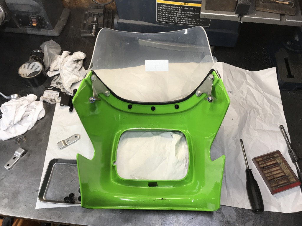 スクリーンはレーシーなイメージでクリアを選択。アクリポイント製で材質は高強度のポリカーボネートです。形状は純正と同じ。