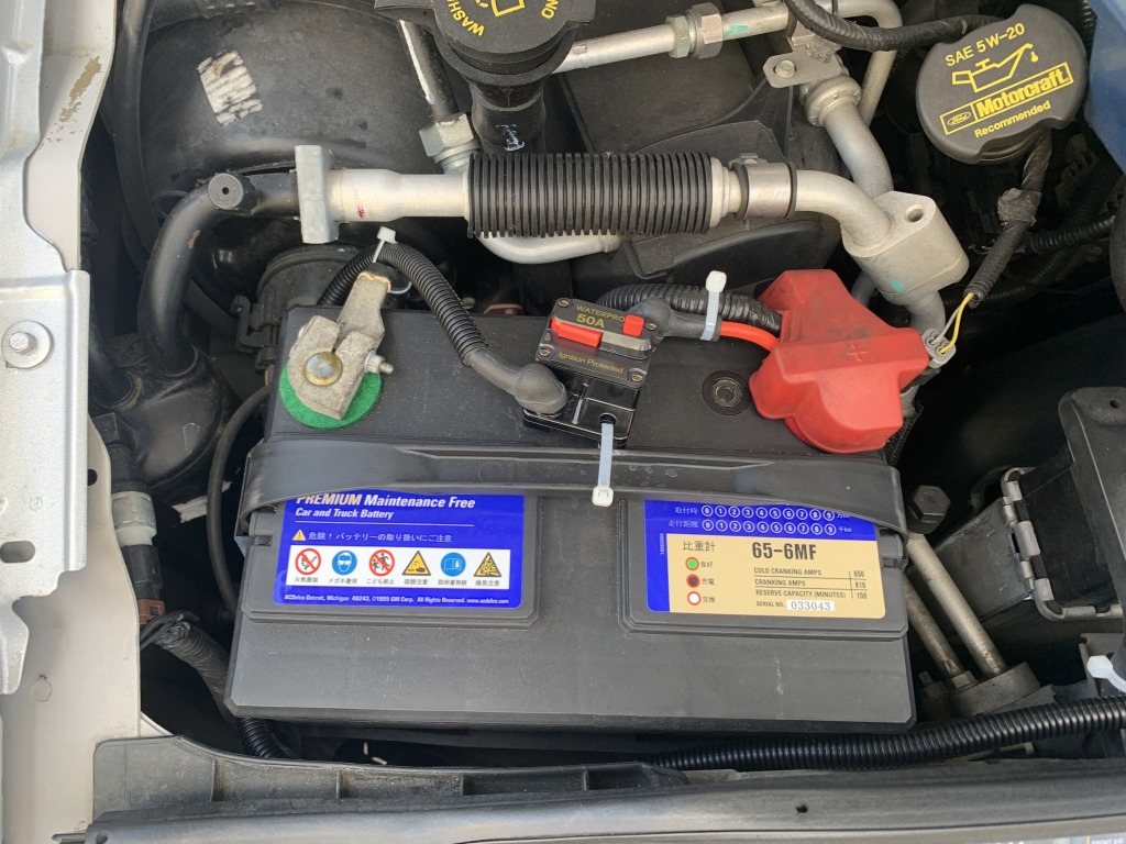 車のバッテリーからの充電用配線は、大容量のブレーカーを介して床下を通して室内に引き込みました。