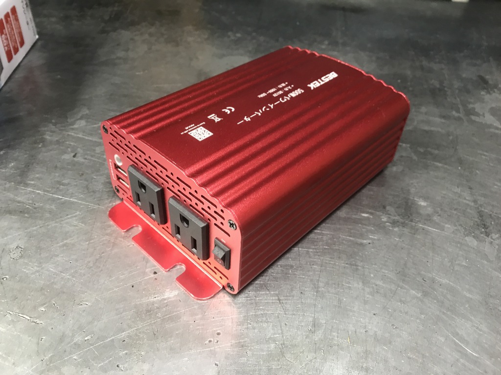 その他に、DC12VからAC100Vに変換するインバーターも設置します。こちらは出力500Wのもの。湯沸かしポットやテレビ位のものなら複数同時に使えます。