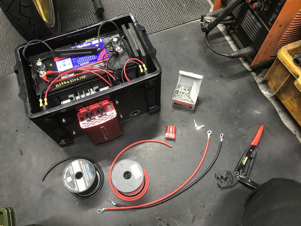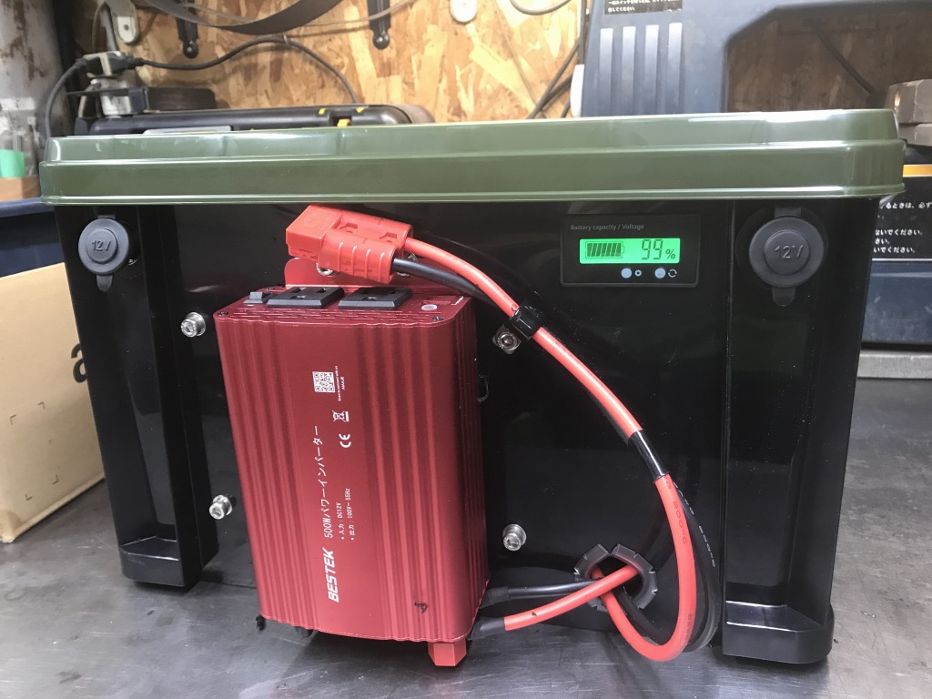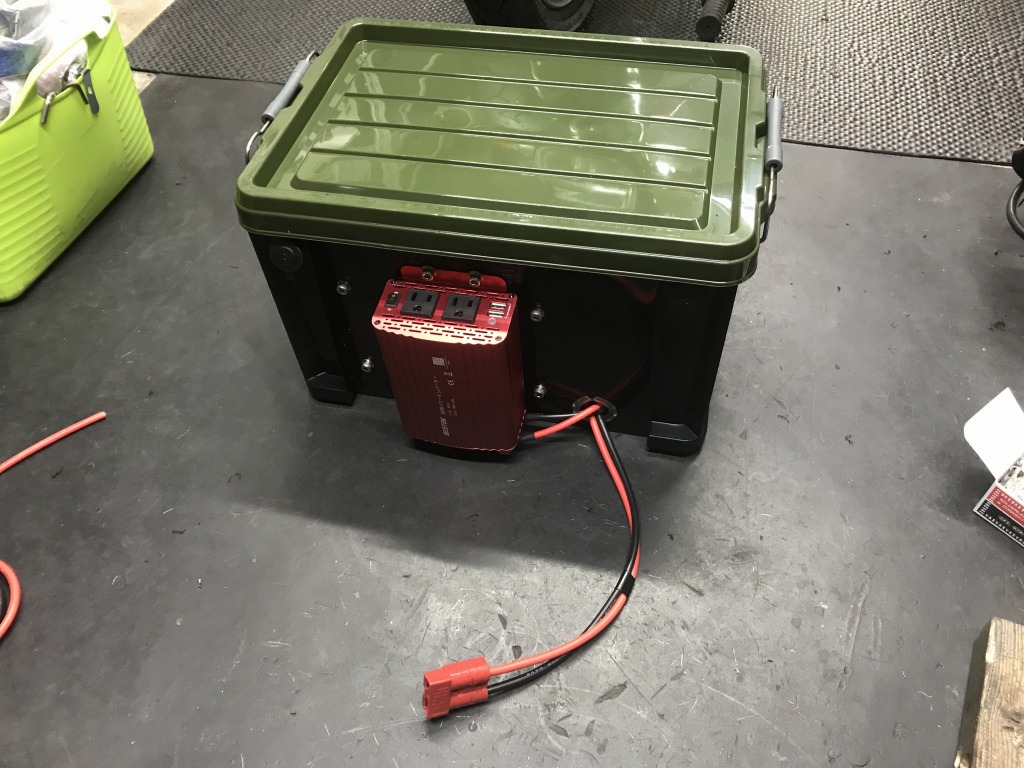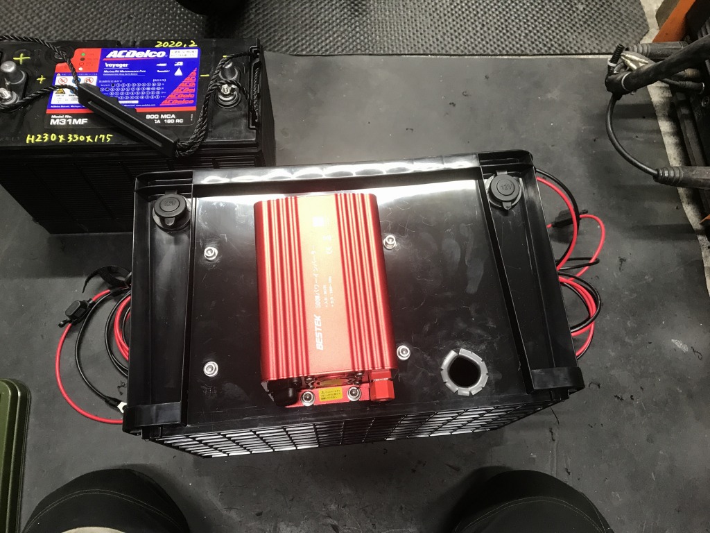 蓋をして完成です。据え置き型ではなくポータブルにしました。太いコネクターは車両のバッテリーとつなぐケーブルです。