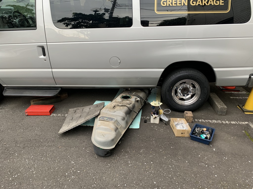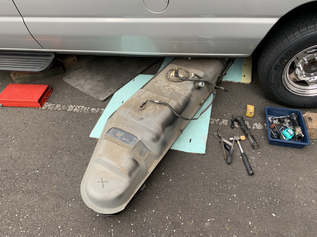 続いて燃料の取出しの為、タンクに加工します。車載のままでは難しいので、タンクを下ろして作業します。