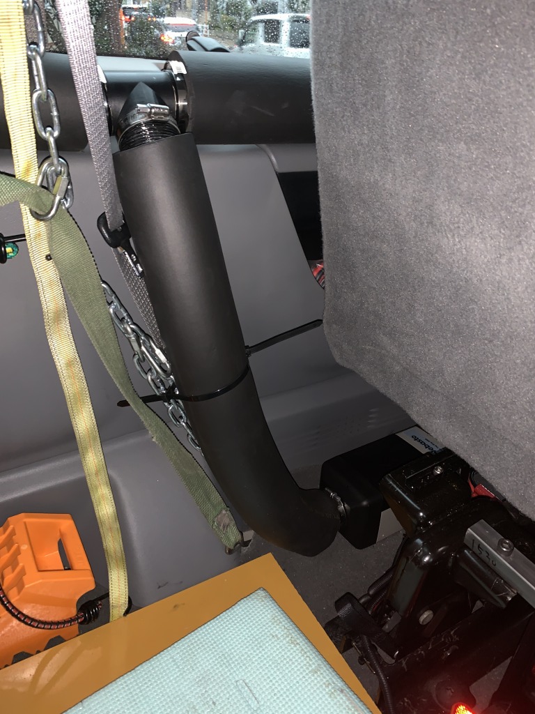 こちらが本体です。パイプは上が燃焼用の吸気口、下が燃焼ガスの排気口です。燃料はガソリンで、車のタンクから取り出します。温風は熱交換器を通って車内を循環するので、排気ガスとは交わらず、一酸化炭素中毒の心配はありません。