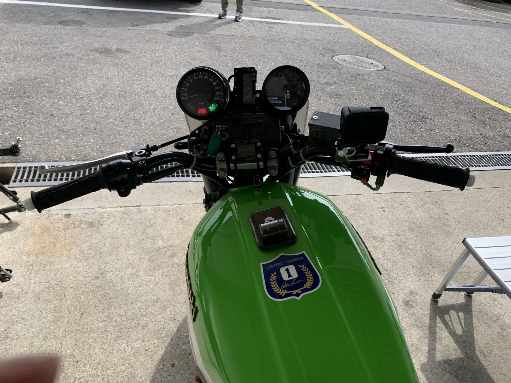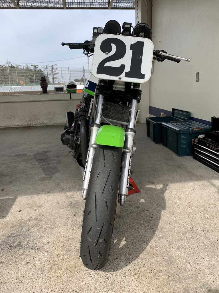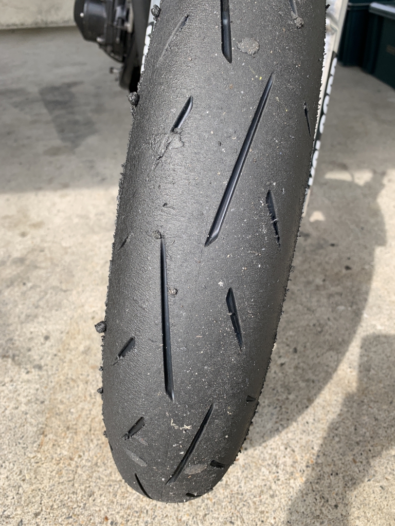 1本目の走行を終えました。タイヤもまだまだいい感じで走れます。フロントはダンロップのα13SPです。