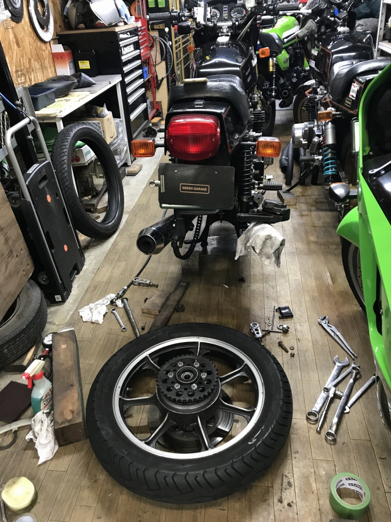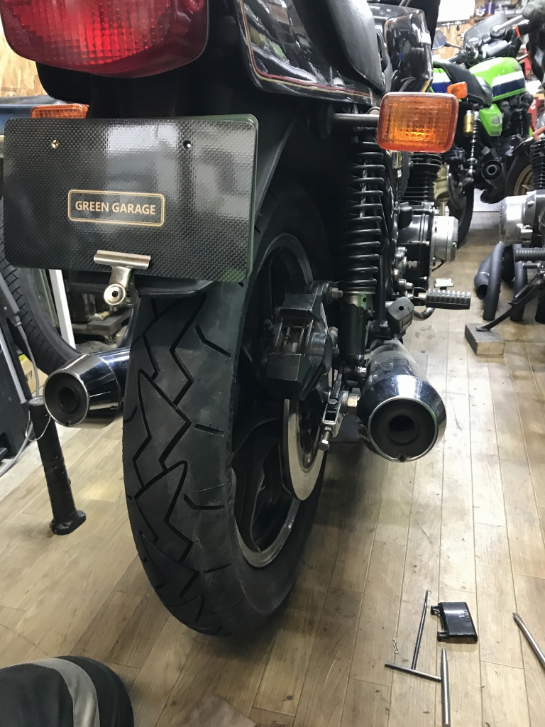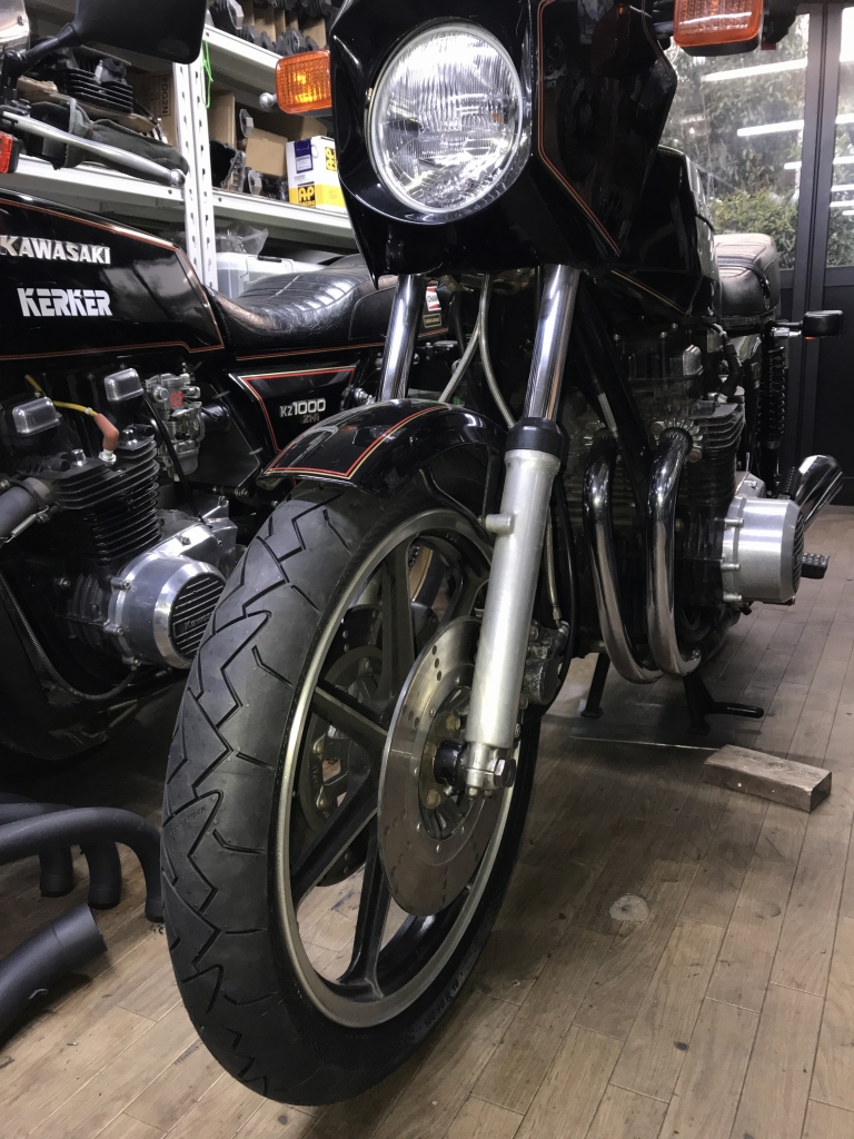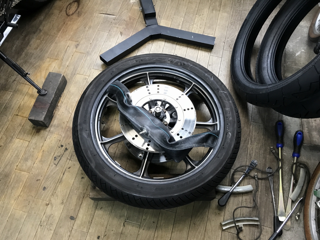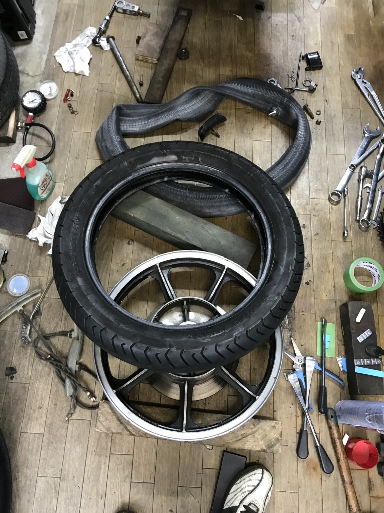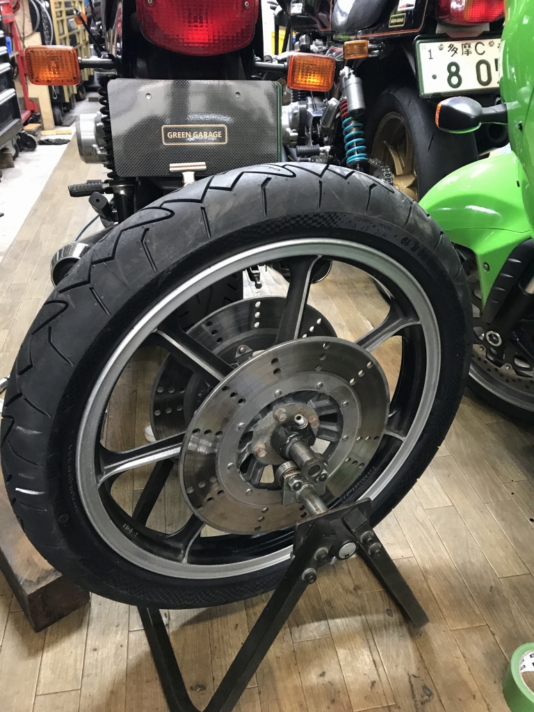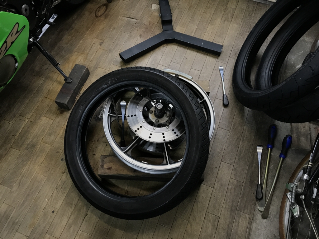 車両購入時からの古いタイヤを交換します。今回はコンチクラシックアタックをチョイス。ノーマルホイールでもラジアルタイヤの軽快感が味わえるのでお勧めです。